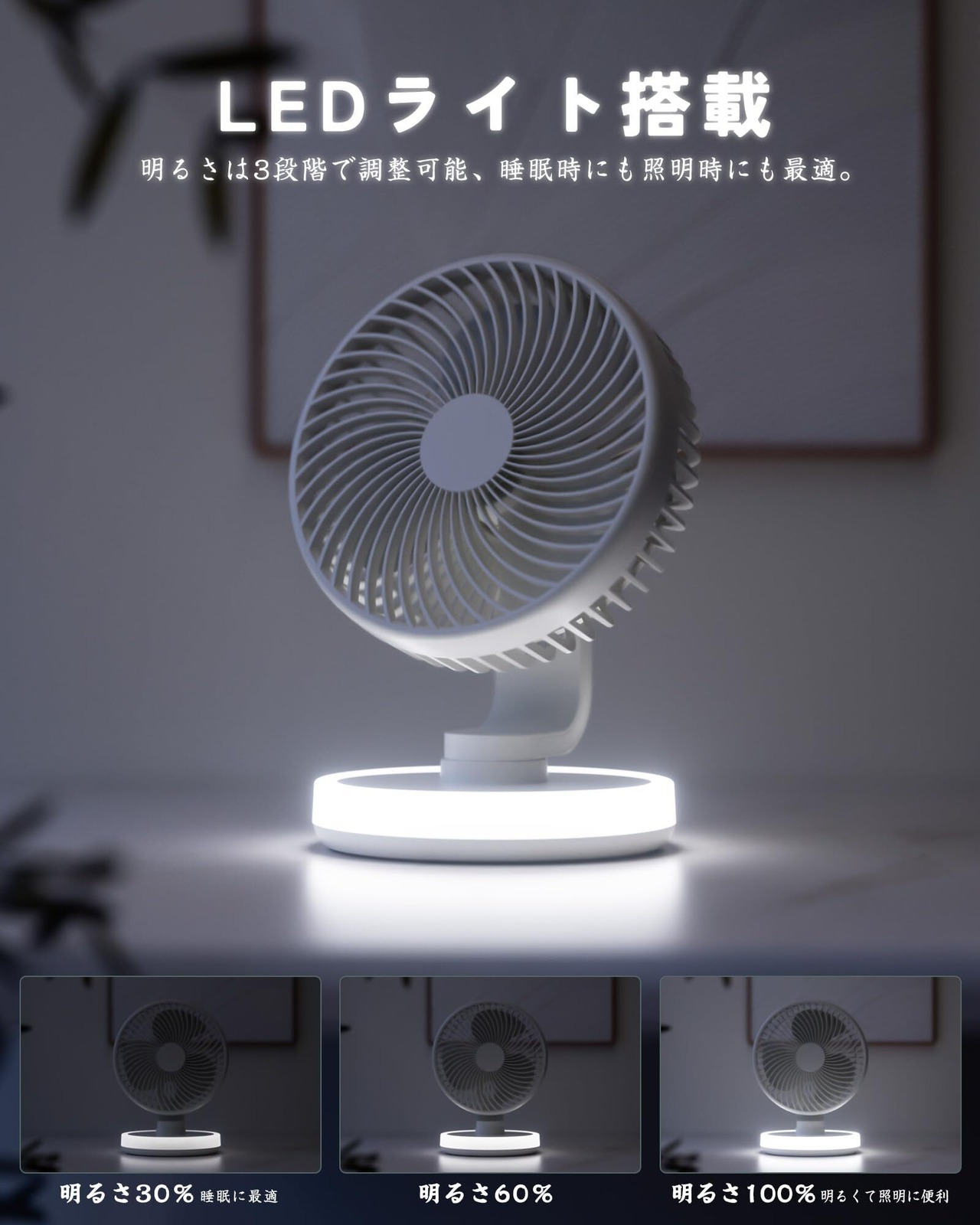 【LEDライト搭載&電池残量表示】3段階の明るさ調節機能(30%、60%、100%)を搭載し、さまざまなシーンに応じて最適な光を提供します。夜間には、ベッドサイドランプとしてリラックスした睡眠をサポートしたり、スマホを操作する際に柔らかい光を提供したり、赤ちゃんへの夜間授乳時の照明にもぴったりです。さらに、電池残量が簡単に確認できる表示ランプがあり、扇風機をいつでも快適に使用できます。