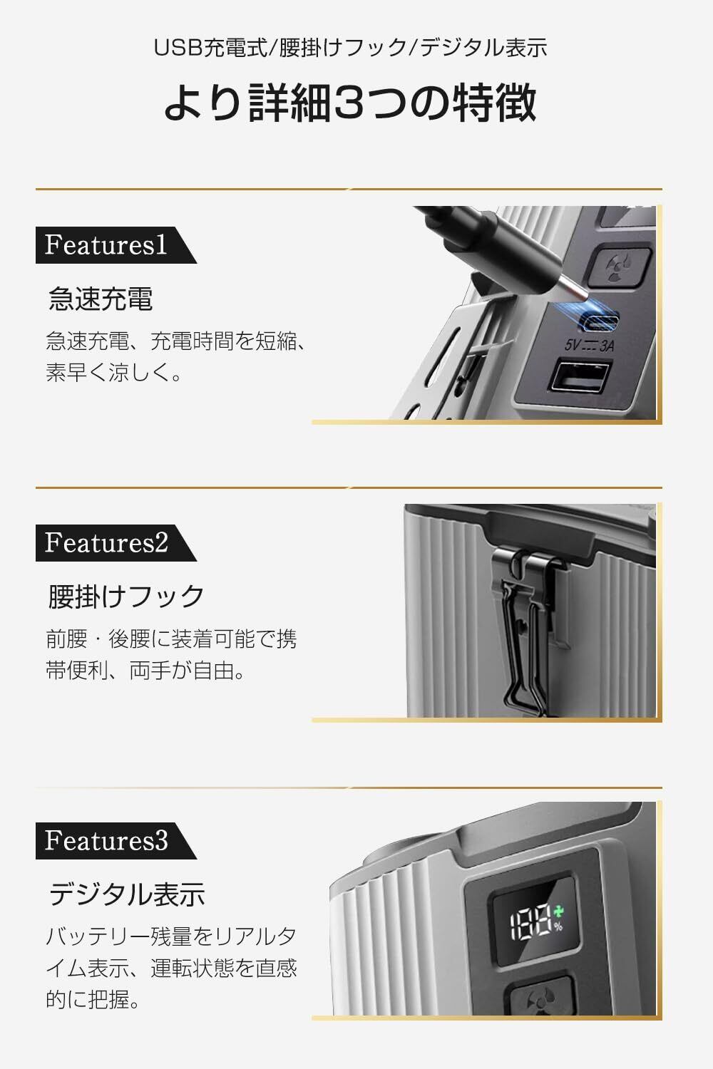 【24000mAhバッテリー内蔵・軽量】24000mAhの大容量充電式バッテリーが内蔵されており、頻繁に充電する必要はありません。80時間を超える長時間の使用が可能です。扇風機の電源としてだけでなく、モバイルバッテリーとしても使えます。コンパクトな設計を採用します。軽量で持ち運びが簡単になります。アウトドア活動など様々なシーンで暑さ対策用品として大活躍の腰掛け扇風機です。