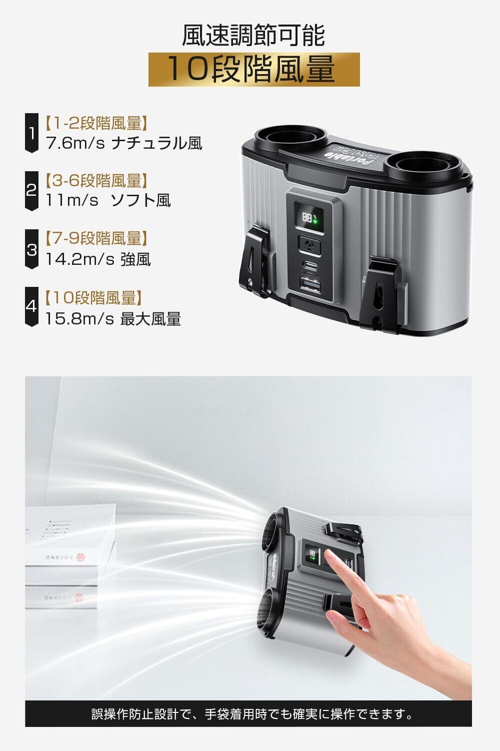 【10段階風量調節可能・静音】10段階の風量調整機能を搭載しており、ワンボタンで簡単に風量を選択できます。この腰掛け扇風機は心地良い微風から熱を一気に吹き飛ばす強風まで自由に調整でき、オフィスなどの静かな環境で使用してもストレスなく快適で、より仕事や勉強に集中できます。超強風で数秒以内に冷却します。炎天下での仕事や旅行をより快適にします。