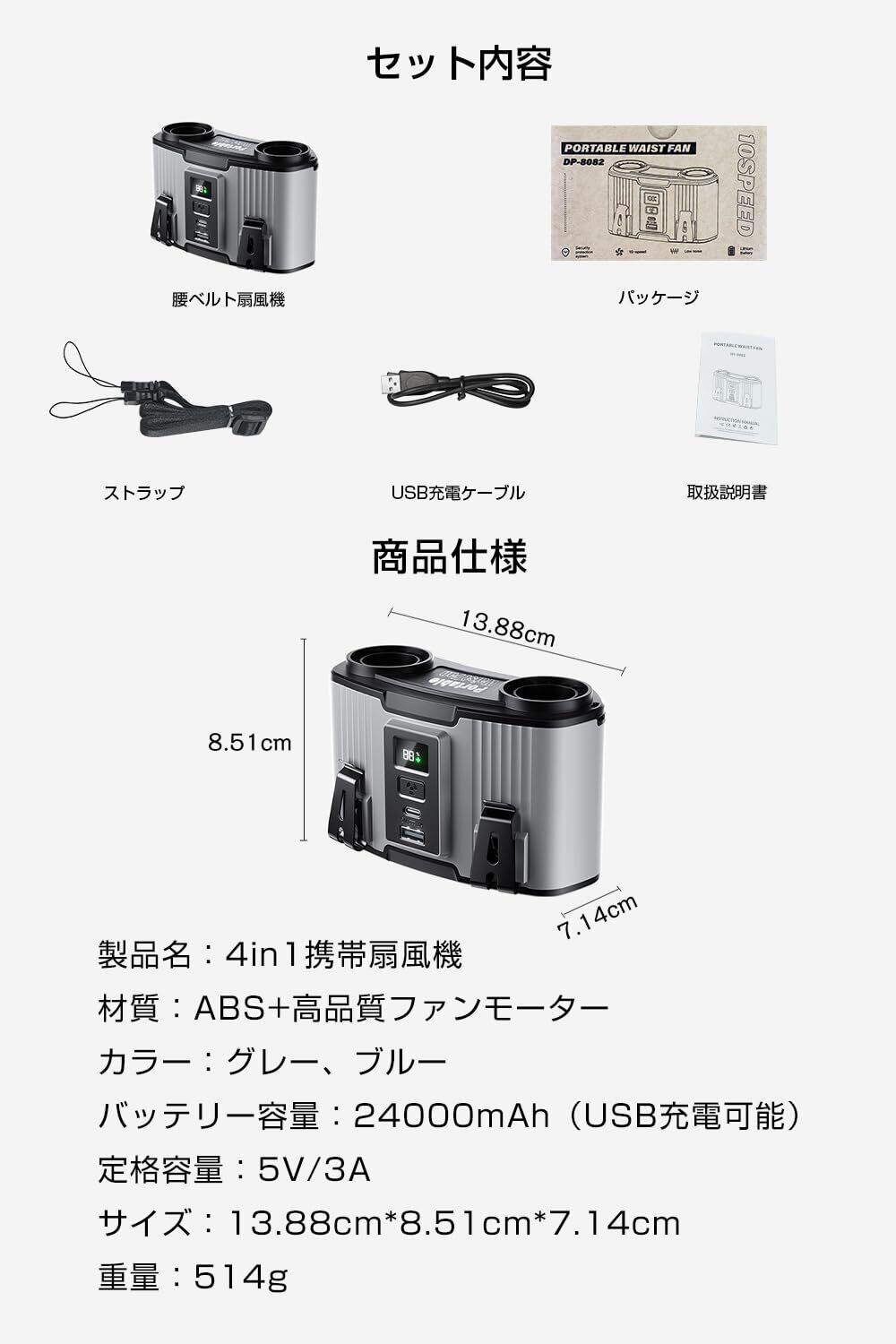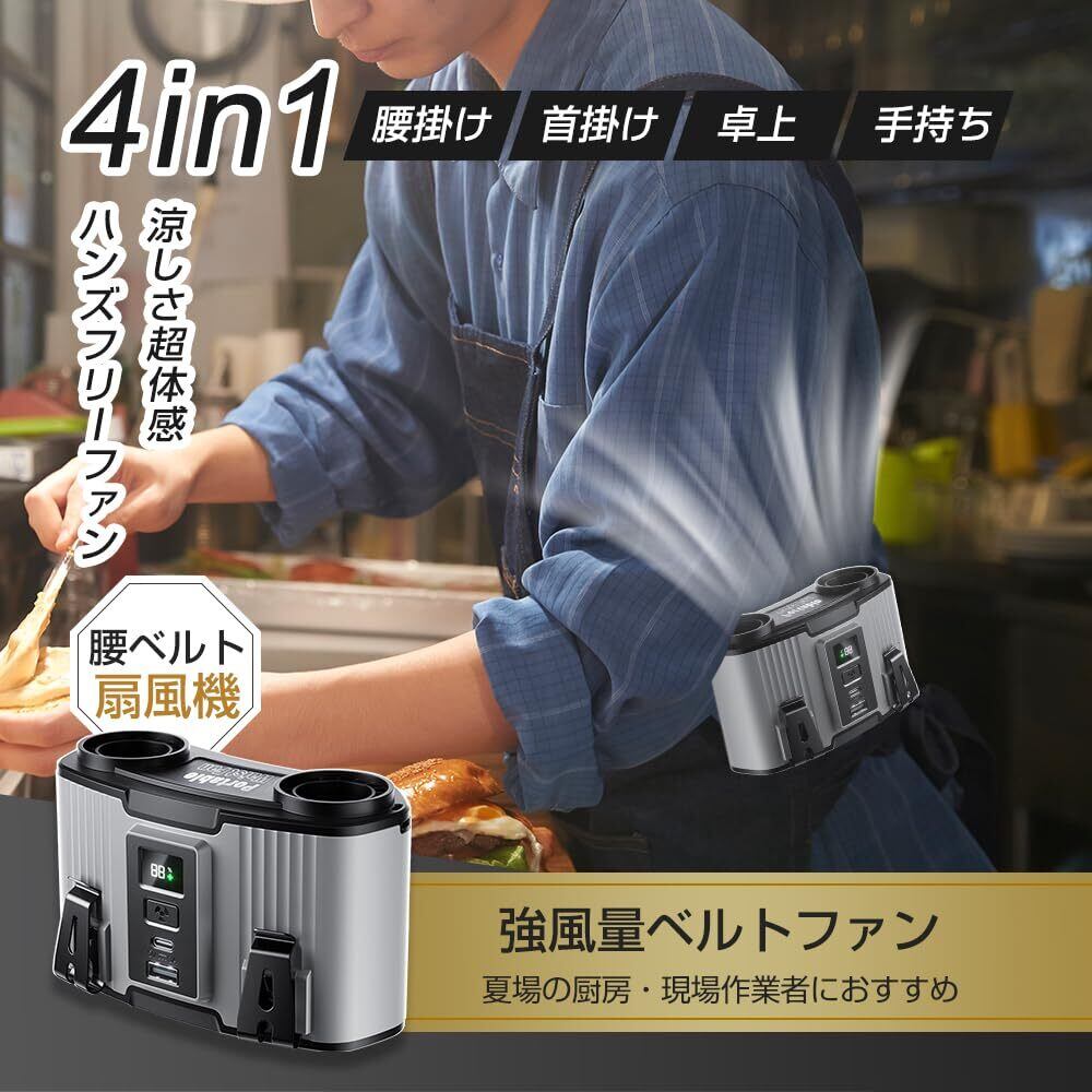 CHUDA ベルトファン 腰掛け扇風機 24000mAh大容量 双風口 10段階風量調節 多機能 腰掛け/首掛け/卓上/手持ち USB 充電式 LED残電表示 携帯扇風機 静音 熱中症対策 強風量(グレー)