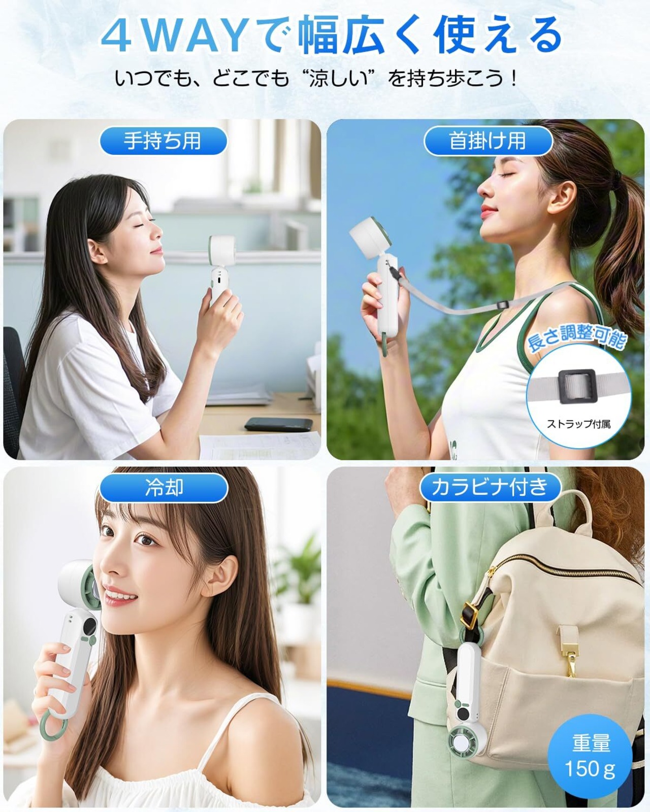 ✨【折りたたみ式・カラビナ付き・ストラップ付】折りたたみ式ハンディファンの改良版!90度調整可能なコンパクトボディで、瞬時に「卓上扇風機」「首掛け扇風機」「手持ち扇風機」の3形態に変形。首元にフィットするソフトストラップと自立式ベースを採用し、両手がふさがるシーンでも安定稼働します。夏の蒸し暑さ対策に、ミニ扇風機は通勤・通学、オフィス、レジャー、イベントなど、様々な場面で手軽に涼しさを提供します。夏の救世主として、このハンディファンは爽やかな夏を楽しむ上で欠かせないアイテムです。