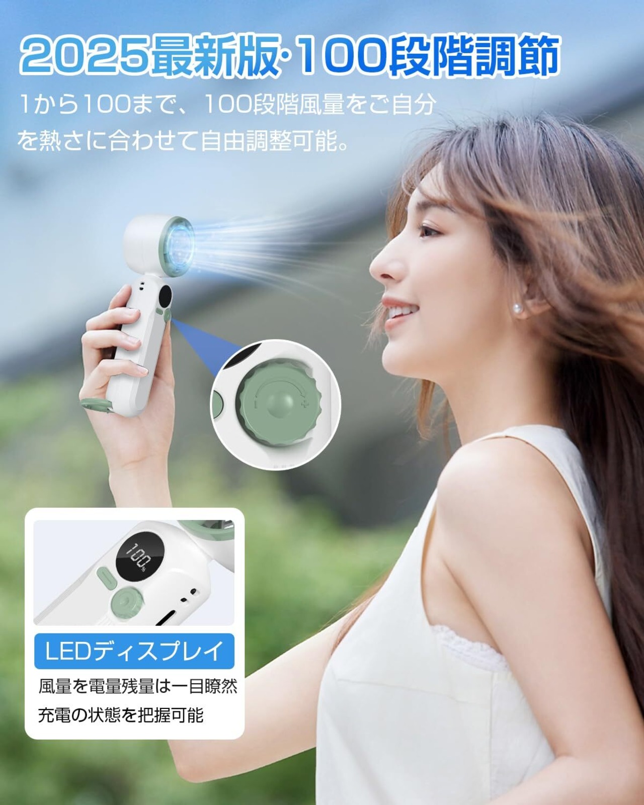 【100段階風量調節・強力送風・ハンディファン】携帯扇風機のダイヤルを回すだけで、そよ風のような微風から、パワフルな強風まで、1~100段階で思い通りの風量を自在にコントロール。使う場所やシーンに合わせて、最適な涼しさを細かく調整できます。5枚羽根設計により、風の拡散を抑え、直進的で豊かな風量を実現。一般的なハンディファンと比較して、より効率的に涼しさを届けます。さらに、の手持ち扇風機はブラシレスDCモーターを採用することで、低風速で低雑音で職場や図書館でも快適に使用できます。