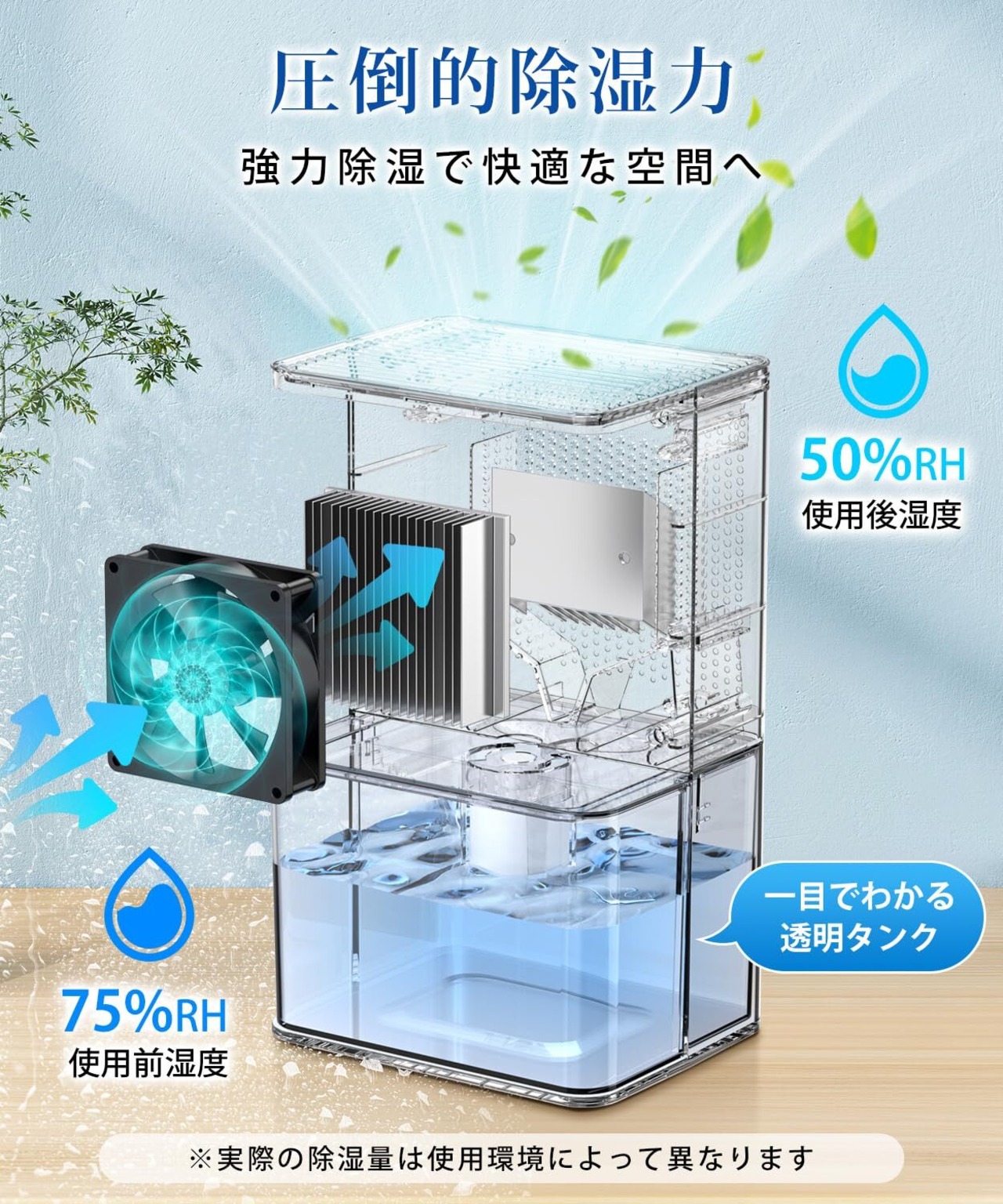 【高性能ペルチェ式除湿で狭小空間も快適に】最新のペルチェ式技術を採用したコンパクト除湿機。1日あたり最大400mLの除湿能力(温度30℃・湿度80%環境下)で、狭い空間の湿気をしっかりコントロール。梅雨時の湿気や結露対策に最適です。小型設計ながらも高効率な除湿を実現し、クローゼット、玄関、寝室、デスク周りなどの湿気を軽減します。