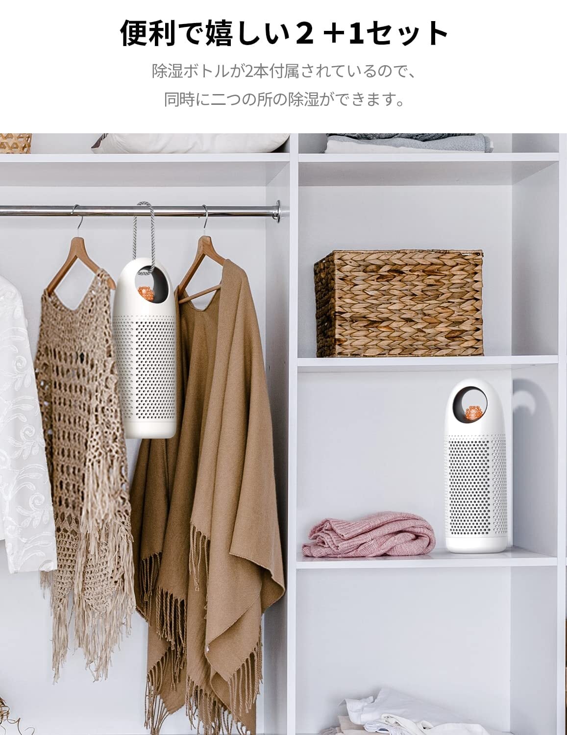 【同時に二つの所で除湿可能】除湿ボトルが2本付属されているので、同時に二つの所の除湿ができます。1本の除湿ボトルは除湿量最大100mlで、対応面積の目安は約3畳。クローゼットなどの少し広めのスペースもピッタリ。