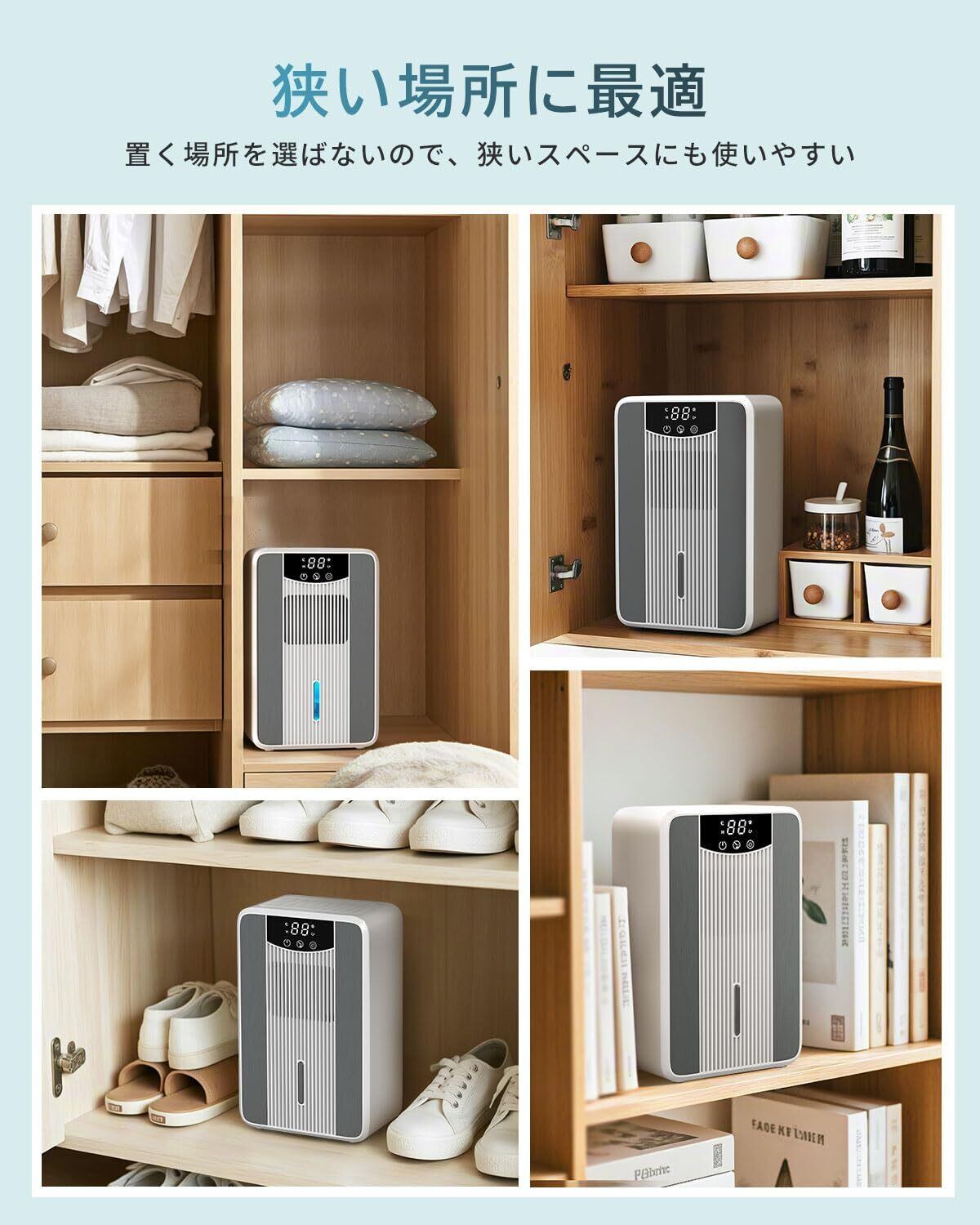 【省スペースに最適&省エネ設計】この除湿機は床置き、卓上置きだけでなく、寝室、脱衣所、クローゼット、玄関、下駄箱、オフィス、押入れなど狭い空間の除湿にぴったり、複数の部屋での使いまわしも便利で、一人暮らしでも場所取らずに使えます。除湿機の消費電力はわずか30Wで、1時間の運転でかかる電気代は約0.7円です。これにより、長時間使用しても電気代を抑えることができ、経済的かつ環境に優しい製品となっています。快適さを提供するほか、エネルギーや時間、お金を節約するのにも役に立ちます。