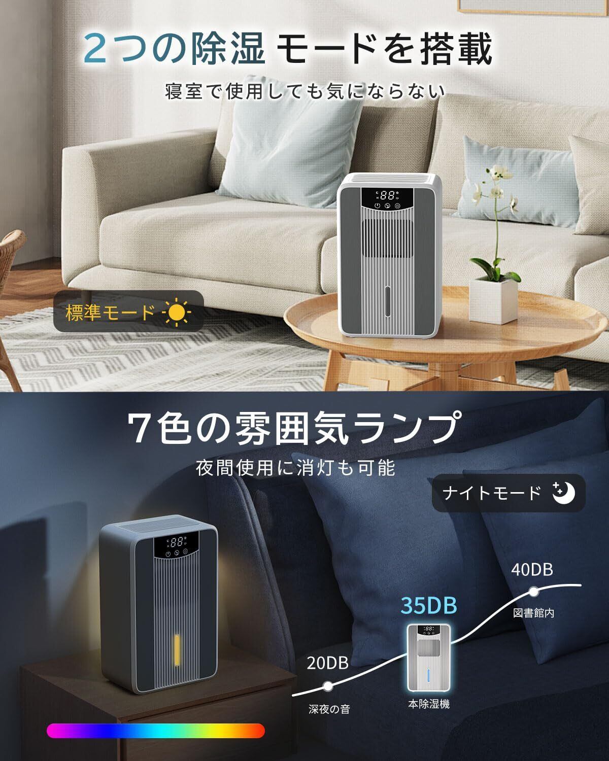 【7色雰囲気ライト&お休みモード】 この小型除湿機は夜間に点灯する7色雰囲気ライトで、家族と一緒に心地よい疲労回復の時間を楽しむことができます。ライトの色を単色にロックすることもでき、お好みの色を設定して夜の常夜灯としても利用可能です!光に敏感な方々はライトを消灯して、静かな睡眠環境で朝までぐっすり眠ることができます。お休みモードの運転音は35dB以下なので、眠りを妨げずに寝室や子供部屋でも安心してご利用いただけます。低騒音で、勉強中や仕事中の集中力が必要な場面でも気軽にお使いいただける部屋除湿器です。