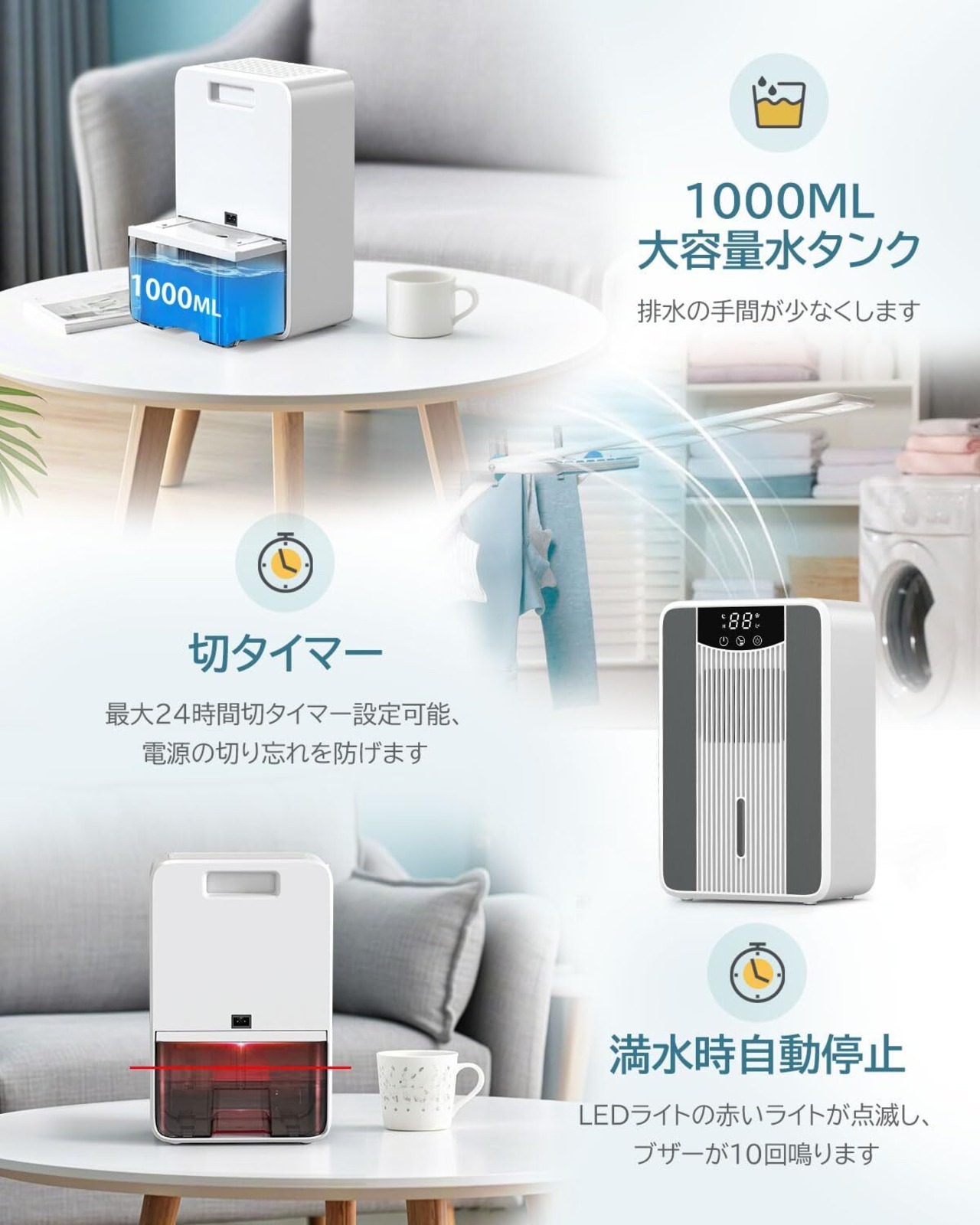 特徴 梅雨/結露/カビ対策, 省エネ、節電, 満水自動停止、自動除霜機能, 4-24時間タイマー付き, 強除湿/睡眠モード