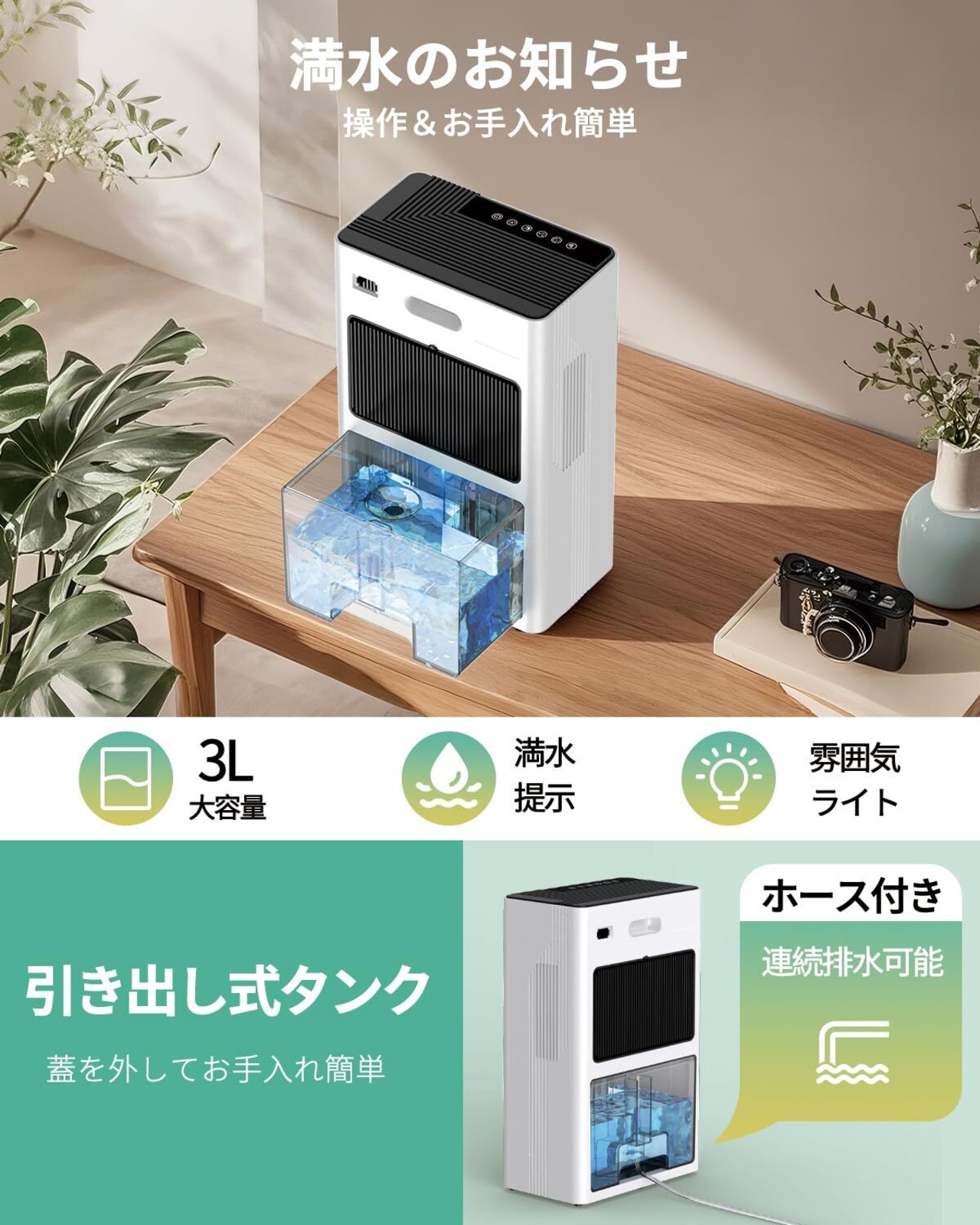 【進化した連続排水機能でストレスフリーな除湿を実現】:この大容量 除湿機の最大特徴である「引き出し式大型排水タンク」は、ワンタッチでスムーズに着脱可能な設計を採用。透明窓付きのタンクデザインにより、水量の確認が容易で、満水時の赤点灯アラートと自動停止機能が連動するため、水漏れの心配がありません。連続使用時には付属の排水ホース(約1.2m)を本体背面の専用ポートに接続すれば、タンク方式と組み合わせて連続運転が可能。※重要注意事項:タンクを装着した状態で移動する際は、必ず本体を45度以上前方に傾けて運搬してください(液晶画面側を下向きに)。水平移動するとタンクが外れやすくなり、水漏れの原因となります。万が一の水漏れを防ぐため、移動時はタンク内の水をあらかじめ空にしておくことを推奨します。