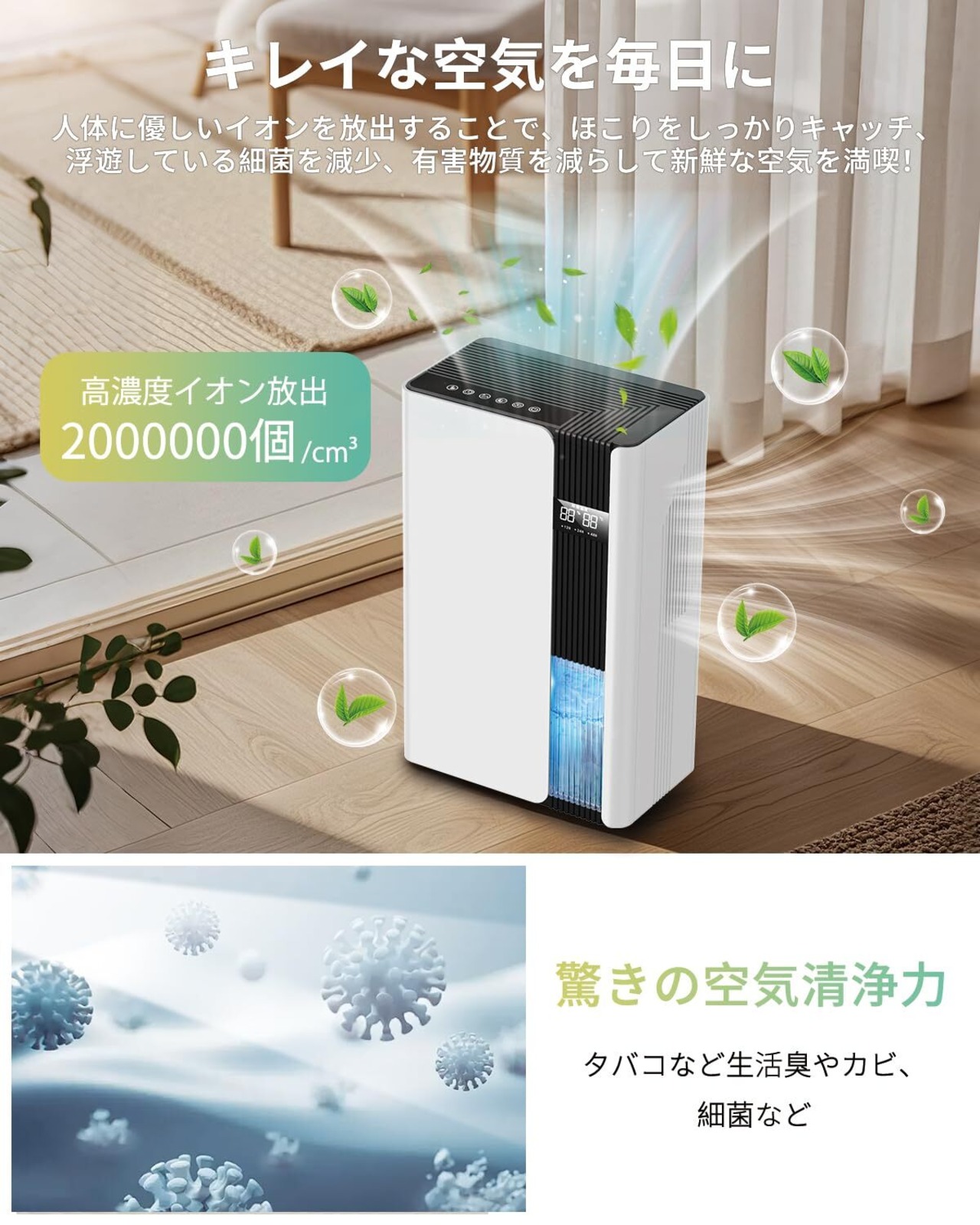 【高パフォーマンス除湿で快適な室内環境を実現】:除湿モードに加え、マイナスイオン機能も搭載。「除湿機 空気清浄機」としての需要に応え、1台で部屋の除湿と空気清浄を同時にサポート。人体に優しいイオンを放出し、乾燥による肌や喉の不快感を軽減、カビ予防やダニアレルギー対策、PM2.5や花粉・ハウスダストを捕集しアレルギー対策に有効。夏場の高温多湿から冬場の低温多湿まで全年活躍します。