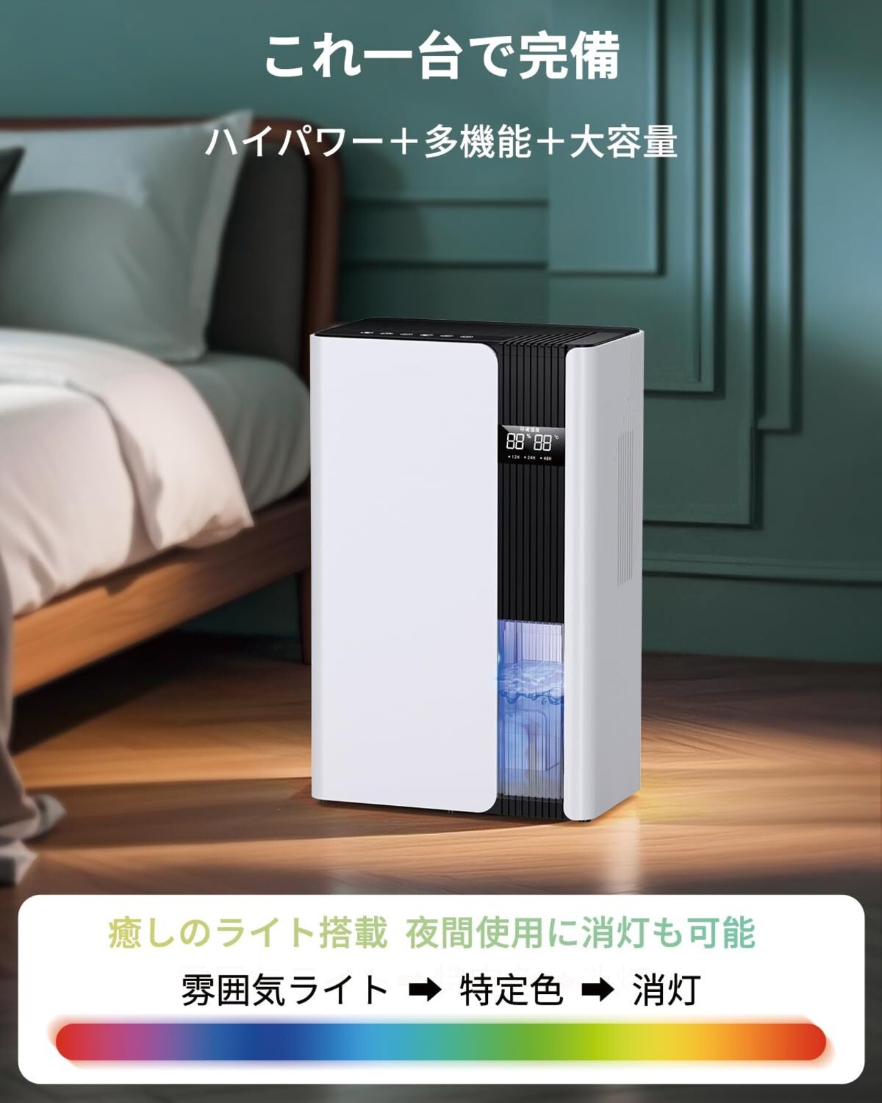 【静音設計&多維光感で紡ぐ安らぎ空間で快適な夜をサポート】:じょしつき 部屋用で就寝時でも安心して使用できる睡眠モードを搭載、30dB以下の超静音運転を実現。さらに、より長く除湿できる48時間のタイマー機能が搭載され、生活リズムや環境に合わせて12H-24H-48H時間を設定することで朝まで快適な湿度を維持できます。雰囲気ライト機能にて色変更も単色も消灯も調整可能で、暗闇でも操作しやすく、柔らかな光でリラックス空間を演出。仕事、読書、睡眠に妨げにならず、静かな睡眠環境で快眠できます。