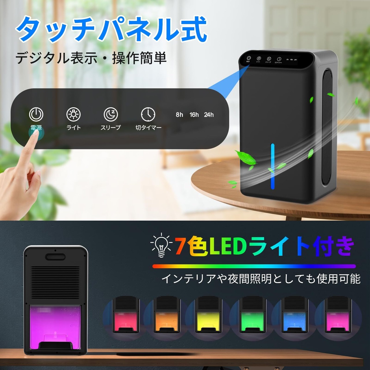 【高級感たっぷりディスプレイ&7色雰囲気ライト】Dawncom 除湿機はタッチセンサー式の操作パネルを採用し、強い力を必要とせず指で0.1秒位軽く触れるだけで簡単に操作可能、かつ、高級感溢れる大画面液晶ディスプレイも搭載しており、タイマー機能などじょしつきの運転状態が一目で確認できます。さらに、七色雰囲気LEDライト付きで、インテリアや夜間照明としても使用が可能です。起動しているときにLEDライトが点灯するタイプは、ベッドサイドのランプとして使用できるので寝室で使用したい人にぴったりです。