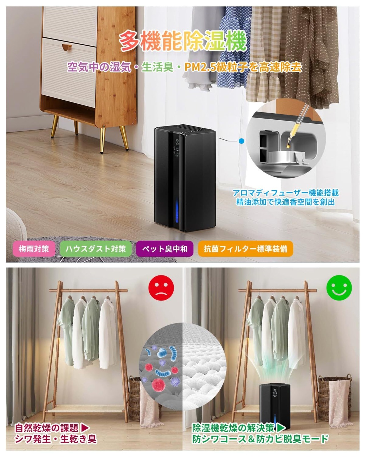 除湿機 衣類乾燥 20畳対応 静音 小型 除湿器 最大除湿量1L/日 タイマー設定&湿度オートオフ 水満自動停止機能搭載 2.5L 大容量 省エネ 部屋干し 消臭 梅雨/結露対策 PSE認証済(ブラック)