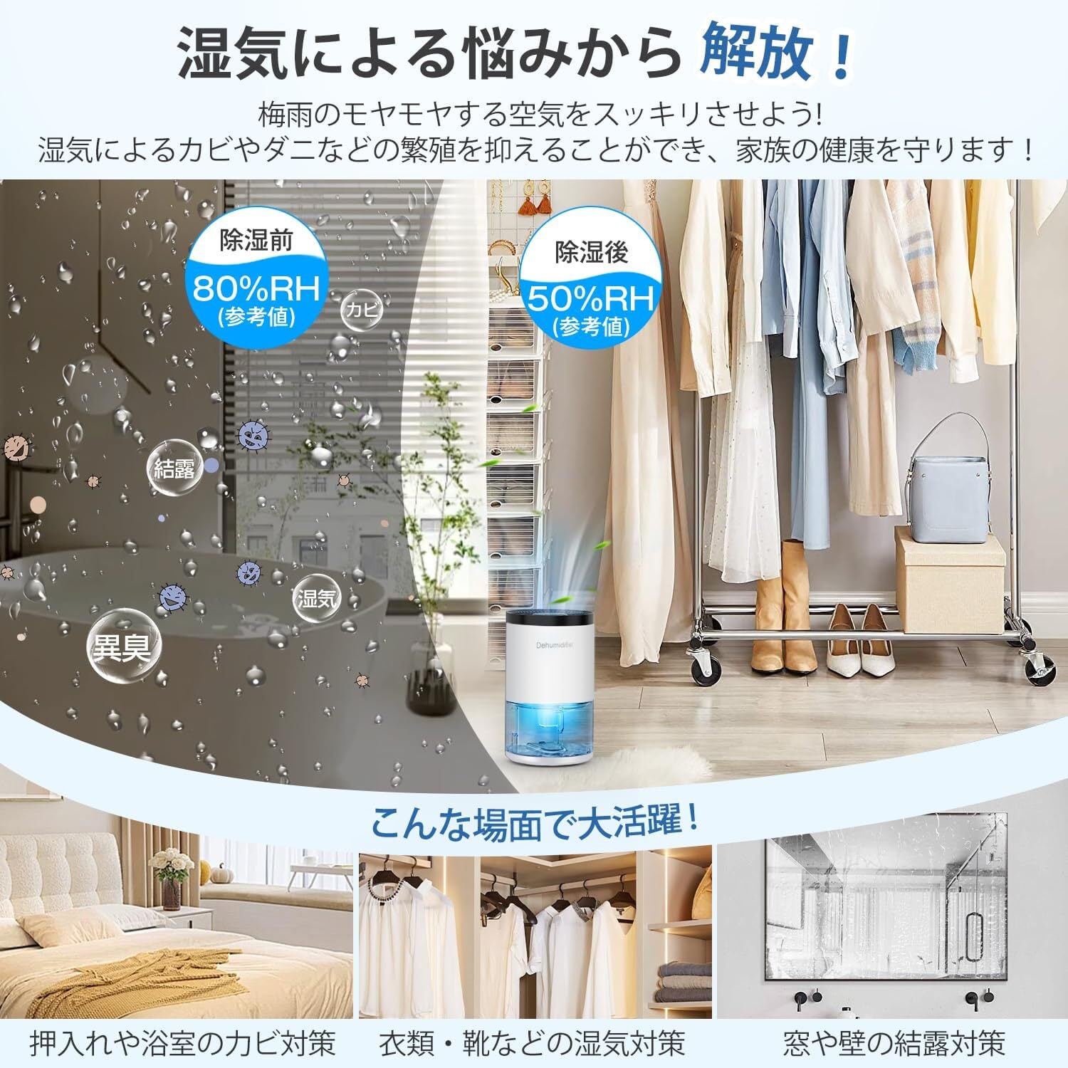 【狭所向け・コンパクト&軽量で持ち運び楽々】本除湿機は小空間に向ける小型商品です。一人暮らしの男女はもちろん、子供の部屋などさほど広くない部屋に最適。除湿器には取っ手も付いているので持ち運びもラクラク。 僅か1.15kgの軽量設計、子供やお年寄りの人でも、片手で気軽に持ち運べる。(15*15*25cm)小型サイズで場所を取らないスリムタイプなので、除湿可能面積の目安:3-9畳(5-15平方メートル) 浴室、狭い寝室、狭い台所、クーロゼット、キャラバン、地下室、ガレージなどの狭い場所に対応できます。寝室/台所/風呂場/脱衣所/洗面所/トイレ/押し入れ/書棚/ クローゼット/玄関など狭い仕切られた空間で使うのに便利。