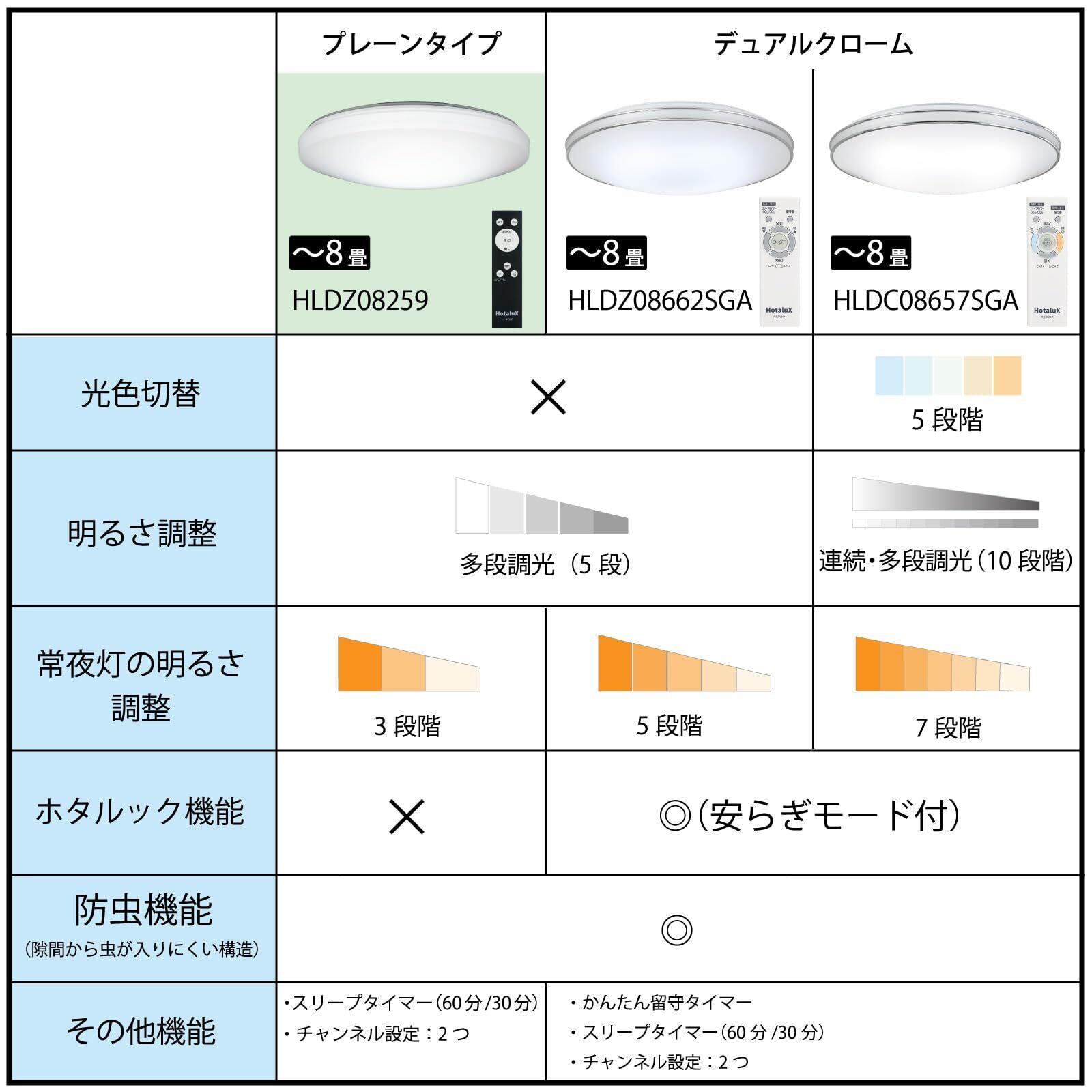 主照明の明るさは5段階から選択可能。更に常夜灯の明るさも3段階から選択が可能です。