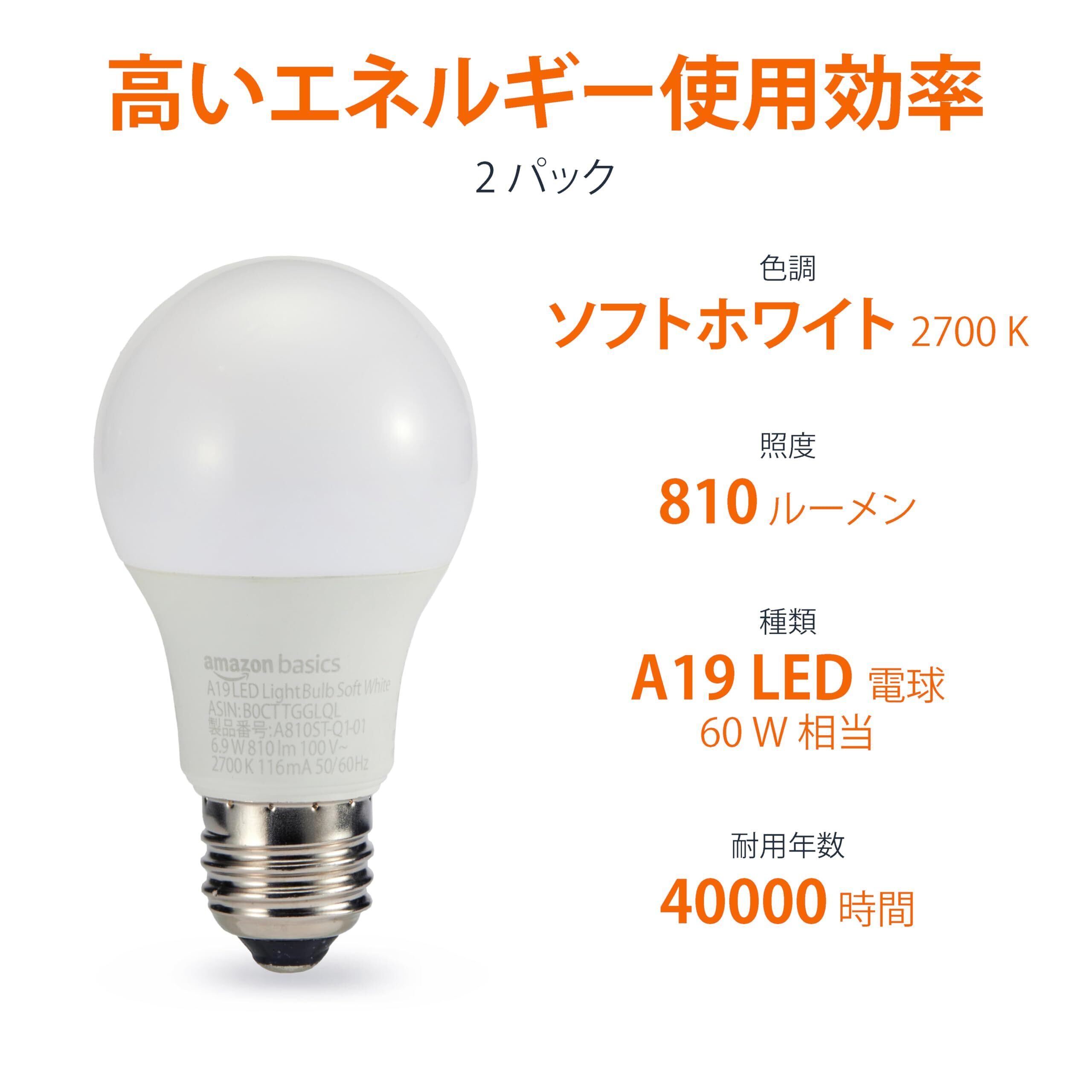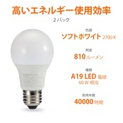ソフトホワイト色温度の60W相当のA19 LED電球 2個セット