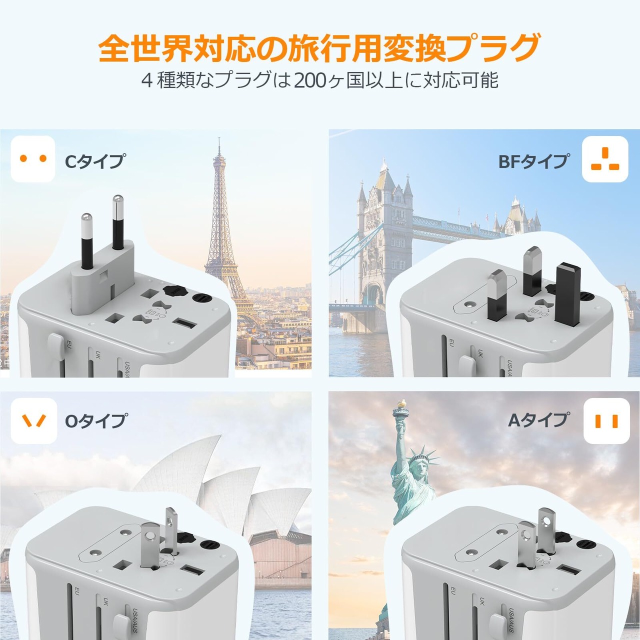 【USBポート付き】この海外用アダプター変換プラグは2つのtype-aポート及び2つのtype-cポートを搭載。単一usb-aポートが5V 2.4Aの出力に対応。usb-cポートが5V 3.0Aの出力に対応。4個usbポートは合計5V 4.2Aになります。USB接続機器はスマートフォンやタブレットなどの多機種デジダル製品の入力電流を自動検知し、最適な電流を送ります。USB端子数の多いものを求めるならこちらの電源変換プラグを持っておくといいでしょう。