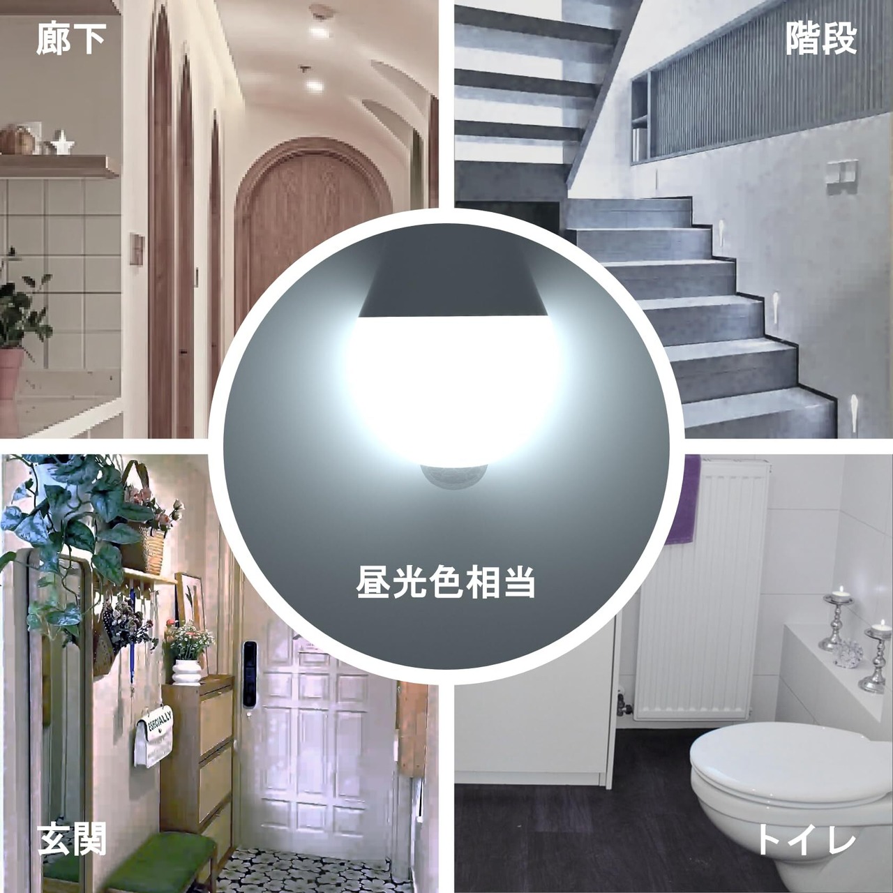 【自動点灯・自動消灯】人感センサー搭載のLED電球。人の動きを検知して自動で点灯します。人の動きがなくなると約120秒後に自動消灯します。消し忘れの手間や夜間の点灯の不便を解消。ご注意:人・動物などが動きを検知し続けると、ライトが点灯し続ける。途中で暗くなってしまう心配がない。