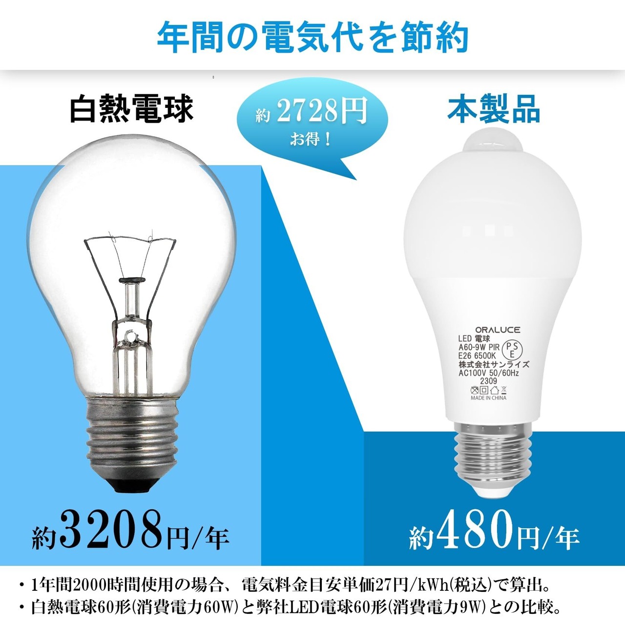 【節電対策】明暗センサーも搭載で、周囲が明るい時(15ルクス以上)には人が近づいても点灯しません。明るい場所では常時消灯。消費電力は9W、明るさ900lm。従来の60W白熱電球に比べ、電気代を約85%削減。より多くの電力を節約します。