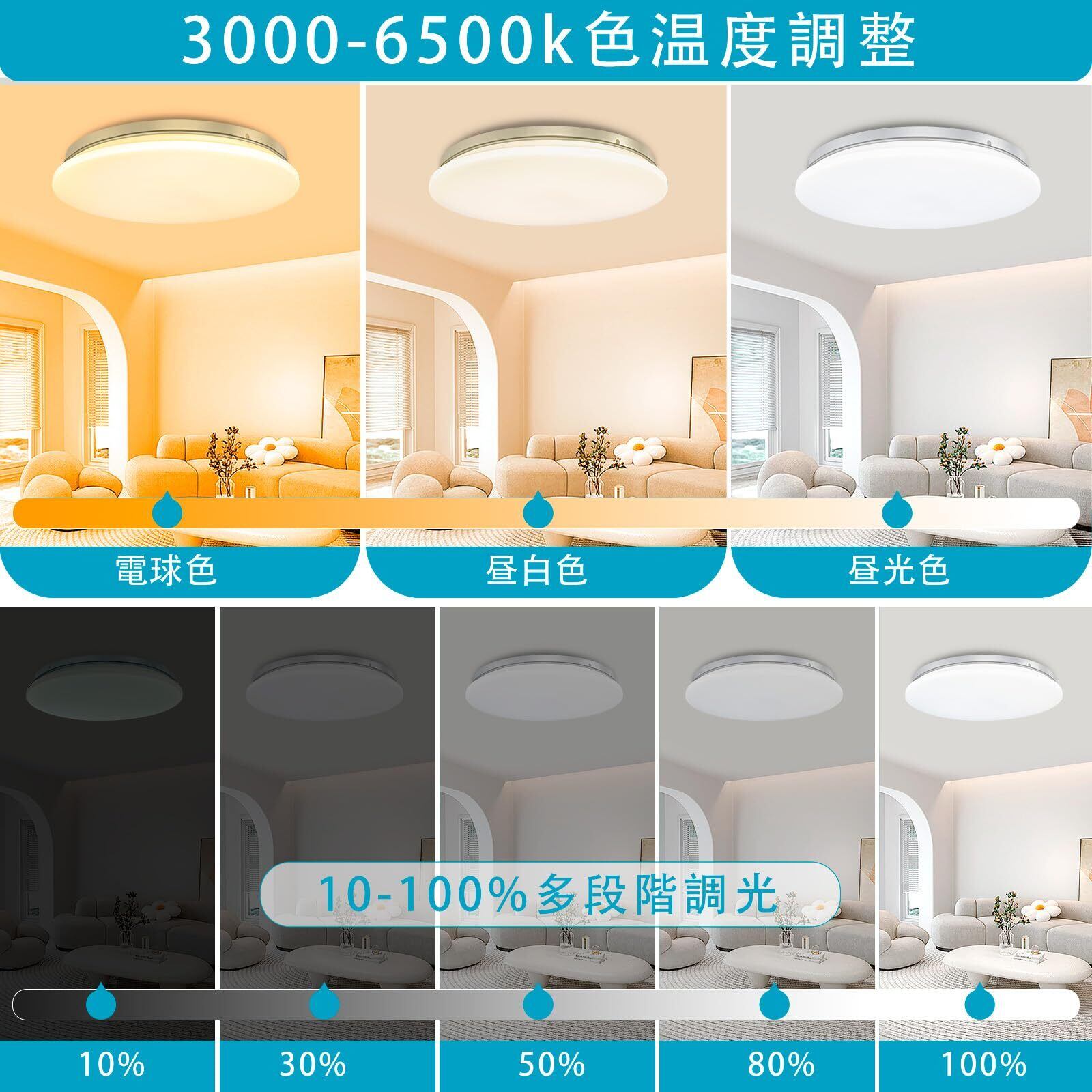 【リモコン付き&調光調色】LEDシーリングライトはの新型リモコンを採用しており(单3形乾電池別途購入が必要),天井照明器具は10段階調光12段階調色可能、。高輝度な智能LEDチップを搭載しており、光がより安定していて明るいです。コンパクトな外観。シーンや雰囲気やお好みに合わせて明るさを調節できる。明るさボタンを長押しと、無段階調光調色ができます。