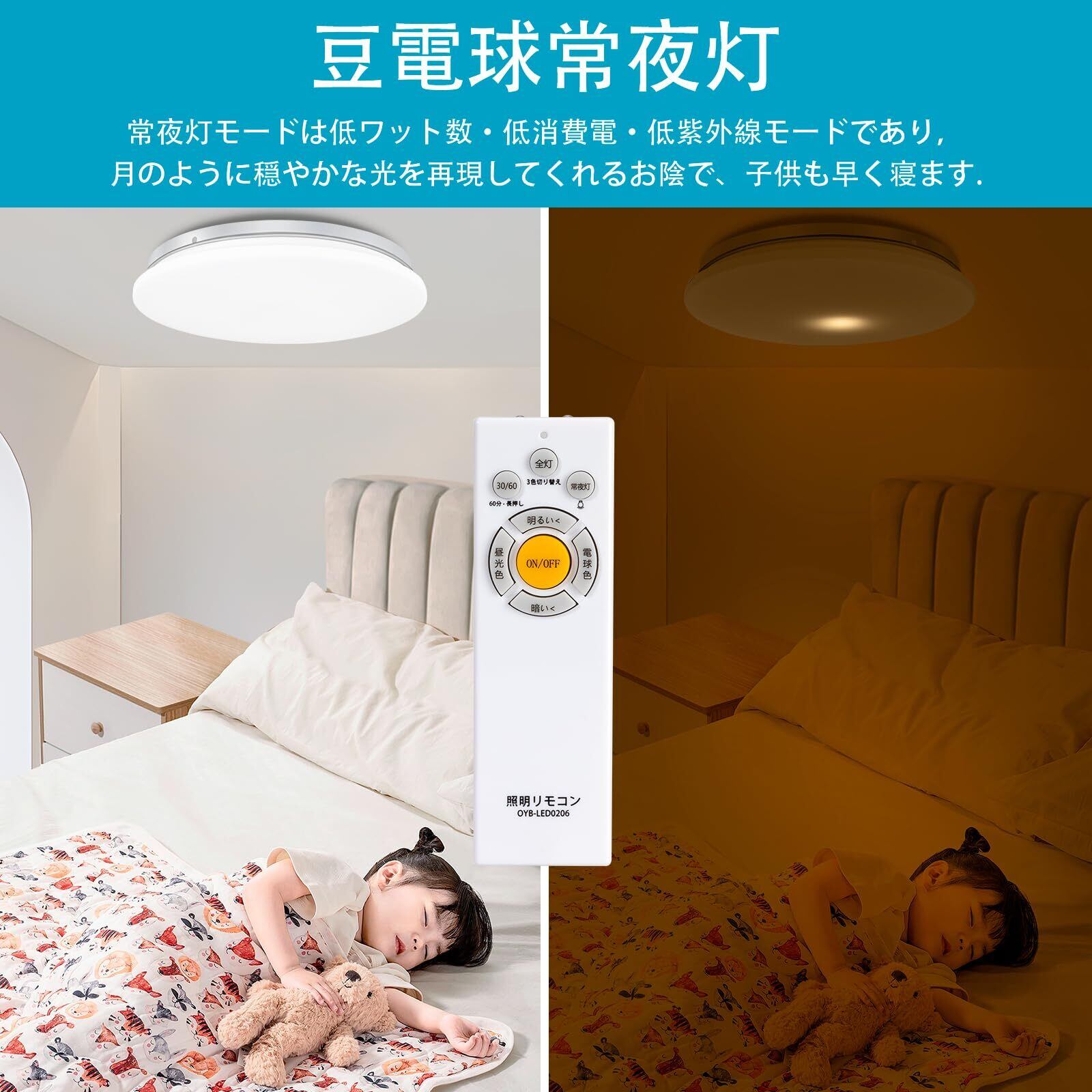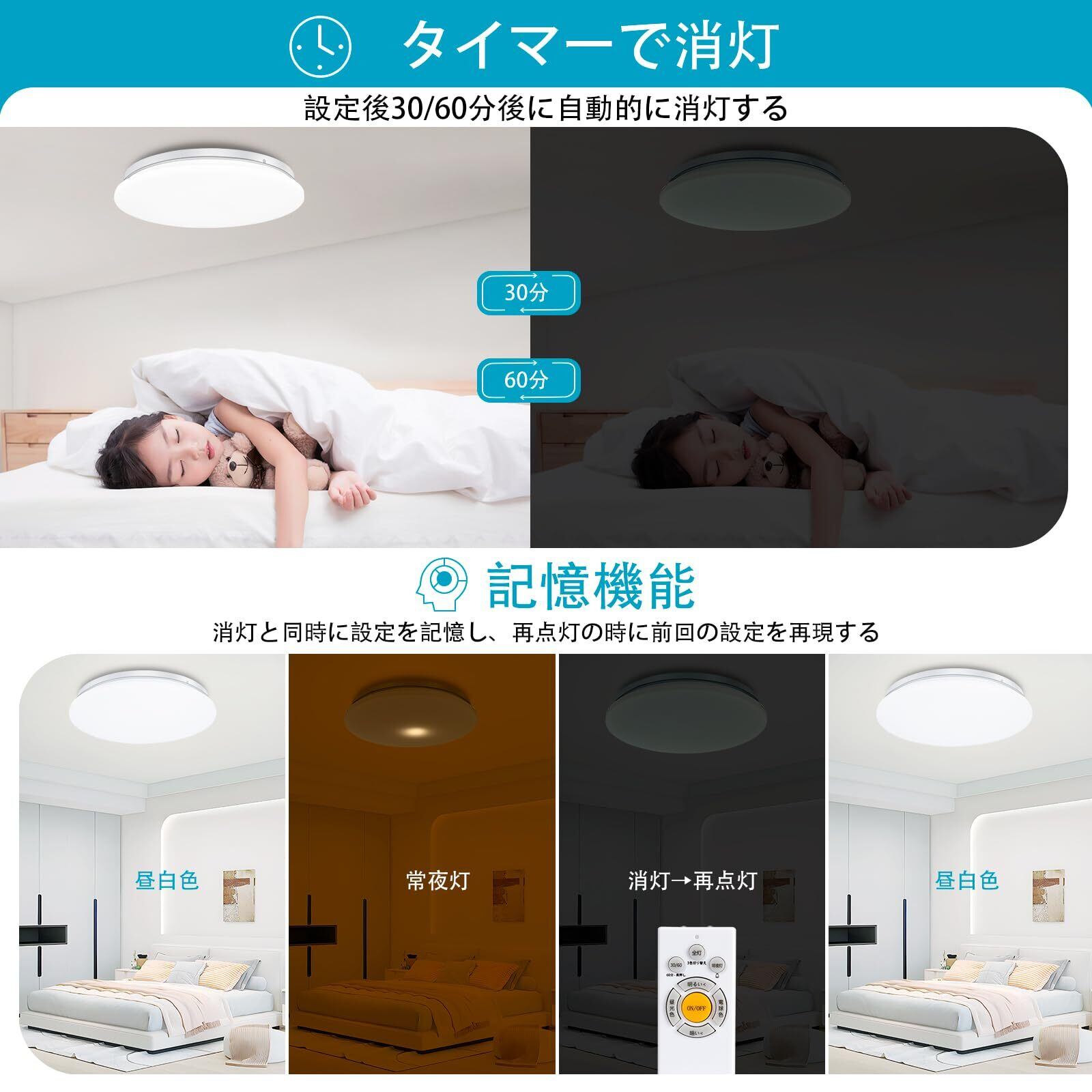 【常夜灯モード、記憶機能、タイマー機能】低消費電力の常夜灯付いており、一人寝て始めてのお子様の部屋また夜間授乳、お年寄りの看護などに最適です。 タイマー機能を設定すると、自動的にシャットダウンできます。電気の節約になり、電源を切るのを忘れたり、電気をつけたまま寝てしまう人に適しています。 記憶機能は選択した明るさを記憶できるので、再び点灯すると同じ明るさを維持します,わざわざ調節必要がなくて。ランプ交換の手間が少ないのも便利です。