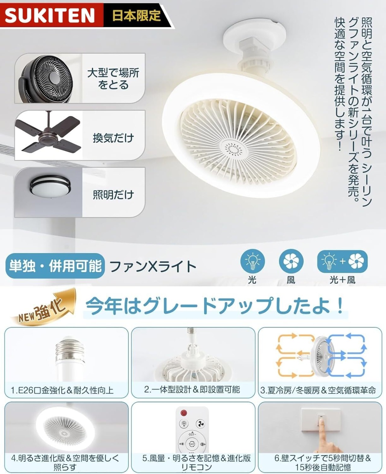 【2025年強化版・正転/逆転機能で一年中快適】SUKITEN大人気のLEDシーリングファンライトに、正転/逆転機能が新登場。夏は涼風、冬は暖風で一年中快適な環境を提供。天井ファンライトは部屋全体の空気を効率的に循環させ、温度ムラを解消します。従来モデル比で風量と明るさが大幅アップし、メモリー機能やより頑丈なE26口金など新機能を追加。これまでにない快適さをお届けします!