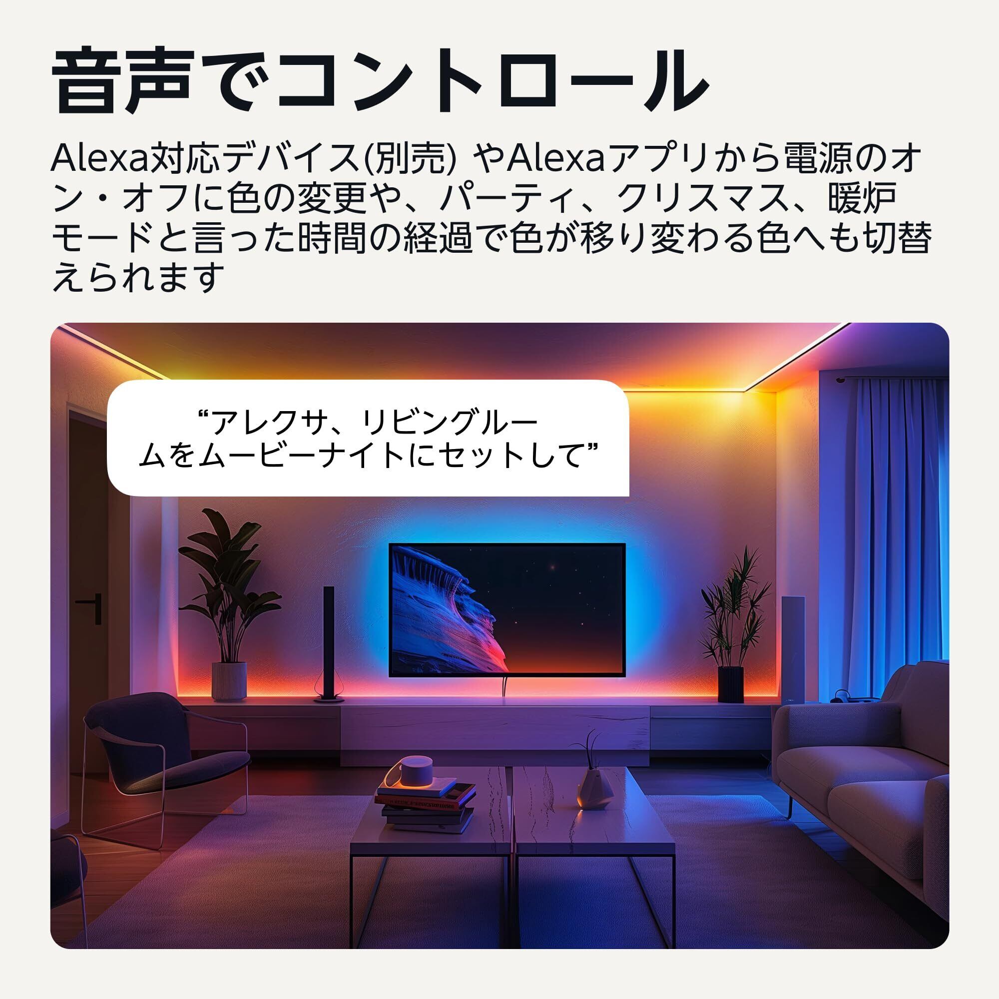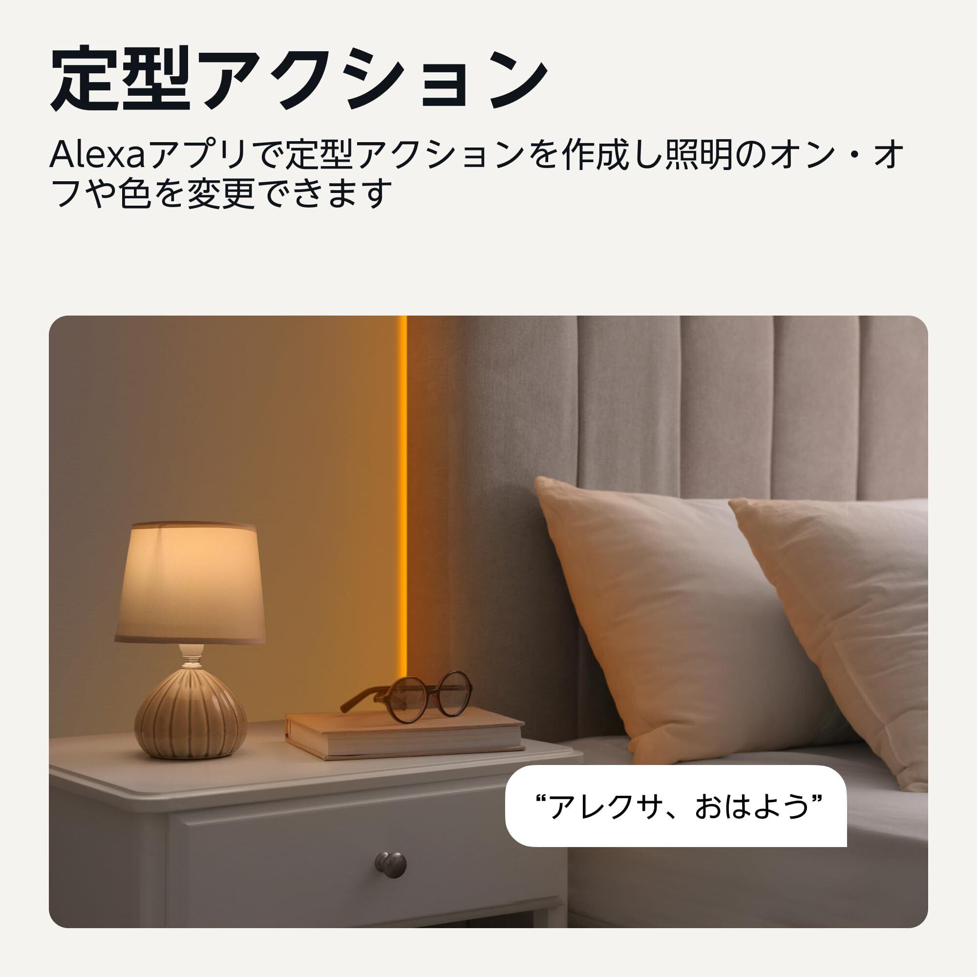 【どこからでも操作可能】 自宅にいないときでも(例:車、オフィス、ジム)AlexaアプリでスマートLEDテープライトをコントロールできます。定型アクションを設定すれば、スケジュールや Echo(別売)のセンサー検知などをきっかけに照明を自動でオン/オフできます。