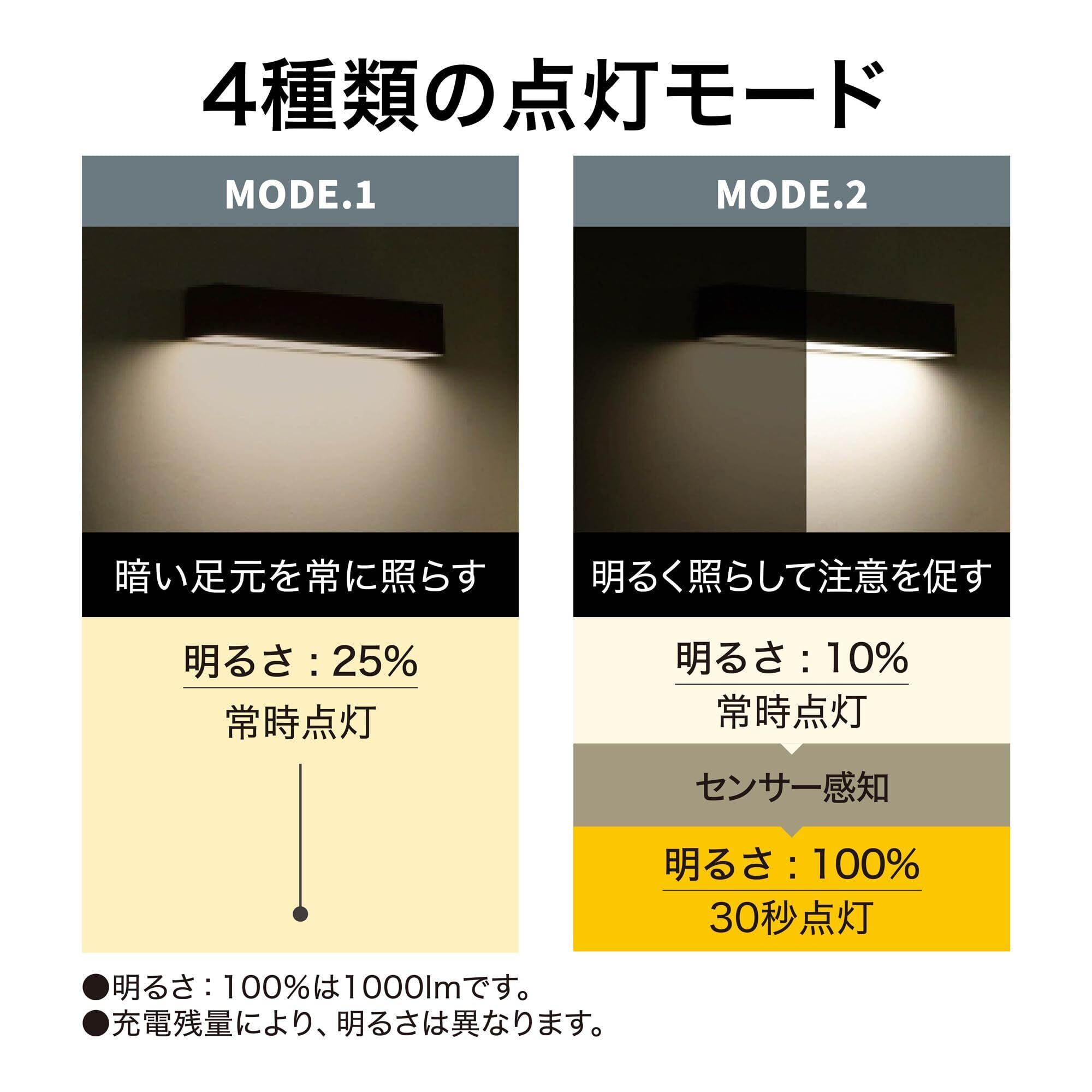MODE.2安全のあかり。 - 明るく照らして注意を促す-明るさ100%。近づくと人感センサーで感知して100%の明るさで点灯。暗くなるとほんのり点灯。明るさ 10%。※LGS-EL01の場合。