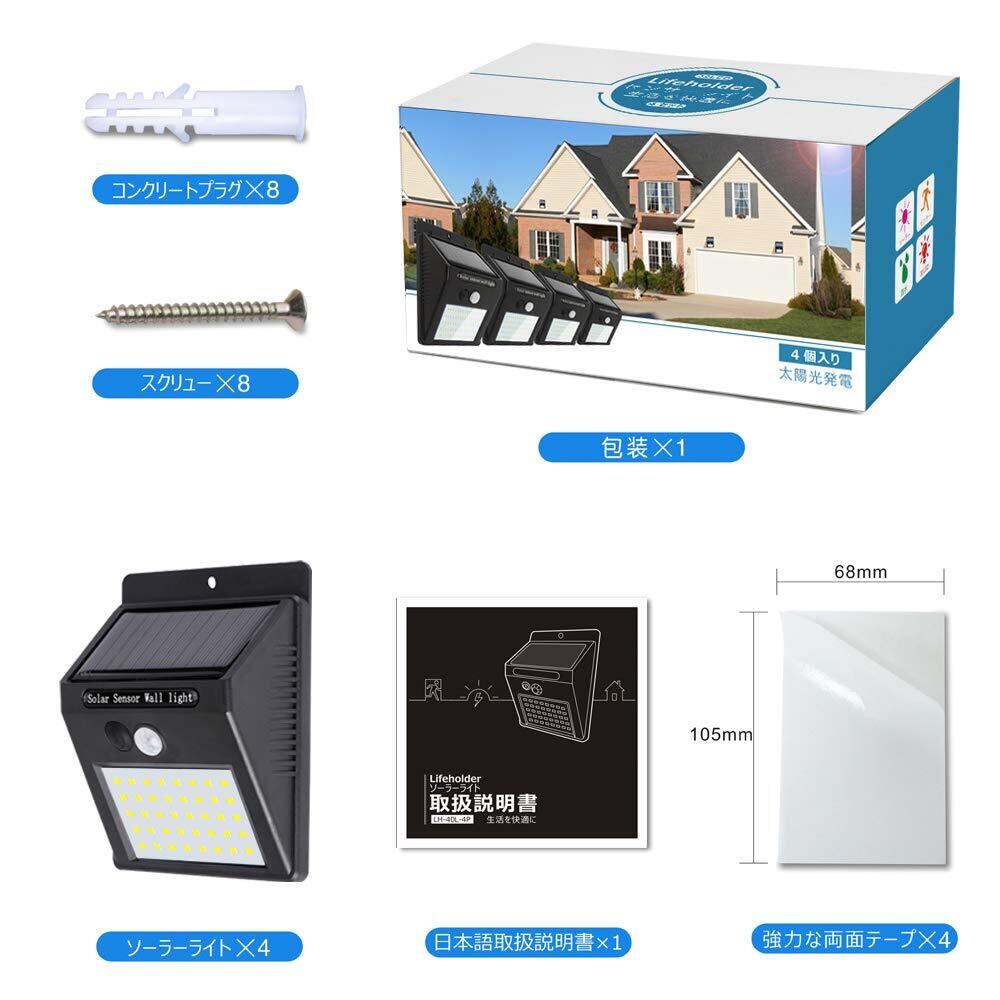 Lifeholder 40LED ソーラーライト 人感センサーライト 太陽光発電 屋外照明 玄関 軒先 駐車場 大活躍 防水 防犯 両面テープ付き 取付簡単 4個セット