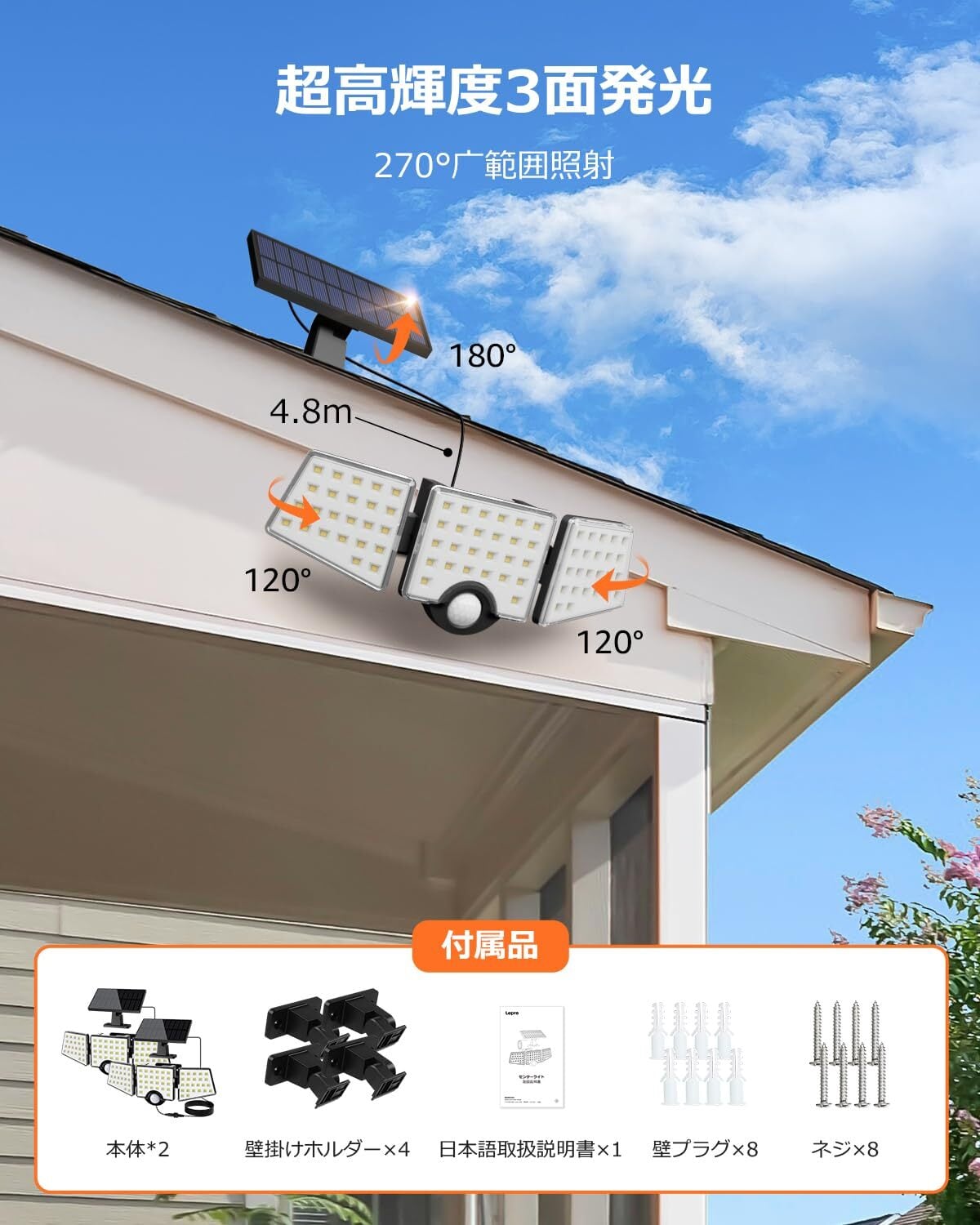 Lepro ソーラーライト 人感センサーライト 防犯ライト ガーデンライト 3灯式 屋内・屋外使用可 夜間自動点灯 昼間自動充電 人が離れたら自動消灯 4.8Mケーブル 1000ルーメン 超高輝度 角度調整 120°感知角度 270°発光範囲 IP65防水 省エネ 壁掛け式 電源不要 駐車場/玄関/軒/庭/ガレージ 防災・停電対策 最新一体・分離型 2個入り ブラック