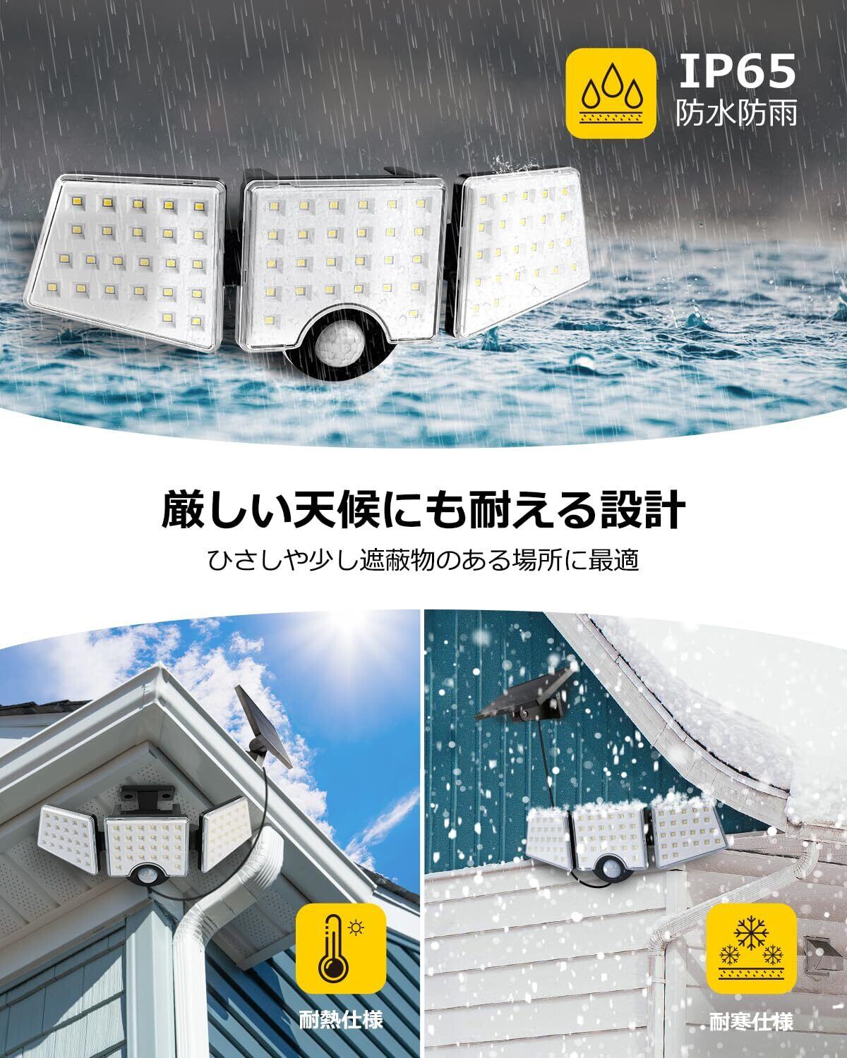 【屋外設置可能!IP65防雨仕様】防水レベルはIP65で、大雨の日でも安心してご使用いただけます。Leproソーラーライトは耐久性に優れたABS樹脂を使用しており、耐熱性・耐寒性にも優れ、悪天候や過酷な環境にも対応可能です。玄関、ガレージ、駐車場、庭、階段、通路、ご自宅周りの防犯など、さまざまなシーンで大活躍します。※複数台を設置する場合は、センサー同士が干渉しないよう、できるだけ距離を空けて設置してください。