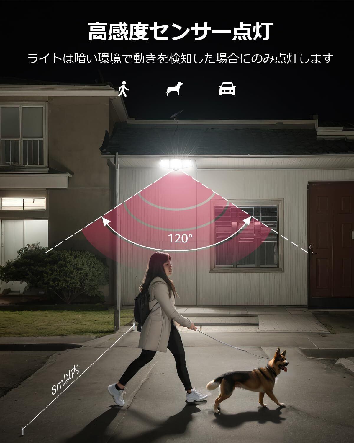 【広範囲照射&人感センサー点灯】昼光色6500Kの超高輝度LEDチップを搭載し、明るく拡散する光で広範囲を照らします。夜間に人や車の動きを感知すると、ライトが自動的に約20秒間点灯します。両側のライトは角度調節が可能で、照射方向や範囲を大幅に広げられるため、コーナーや狭い通路などでも手軽にご利用いただけます。