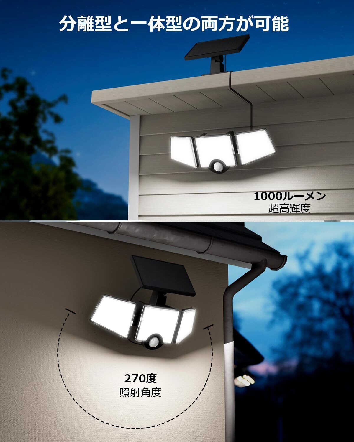 【最新センサーライト:超高輝度3灯式丨2個セット】一体型・分離型の両用設計で、屋外だけでなく室内でも使用可能です。ソーラーパネルはライト本体から分離させることで、付属の延長コードを使って最大約4.8m離れた場所に設置できます。低温環境でも使用可能なソーラー充電式電池を内蔵し、曇りや雨の日でも日中に充電できるため、冬でも安心してお使いいただけます。