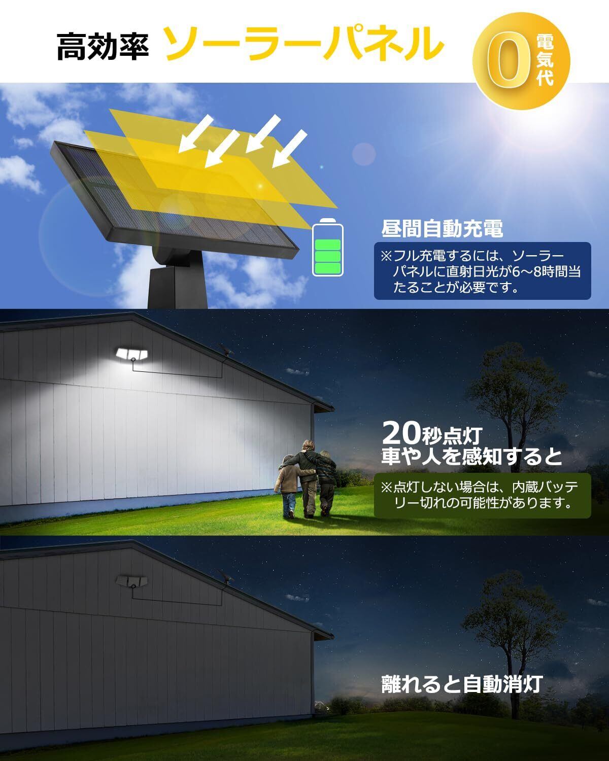 【省エネ&停電・地震対策】一度スイッチをONにすれば、日中の太陽光で自動的に充電され、電気代が一切かからない省エネ設計です。停電対策にも最適で、地震や台風などの災害で電源が止まっても、照明機能はそのまま維持されます。玄関やガレージの入口に設置し、LED投光器としてご使用いただくのもおすすめです!