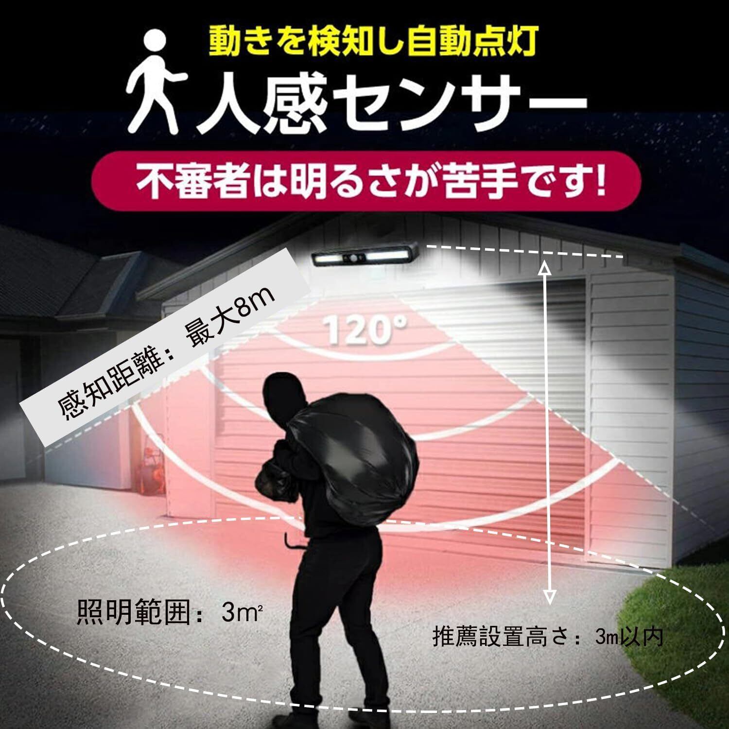 【人感センサー・防犯対策】ソーラーライトは明暗センサーを搭載し暗くなると自動点灯します。時間センサーも搭載、夜で動きを感知して自動に点灯、人が離れると、自動に消灯します。120°検知角度と最大8mの検知範囲で、防犯ライトとしても大活躍!