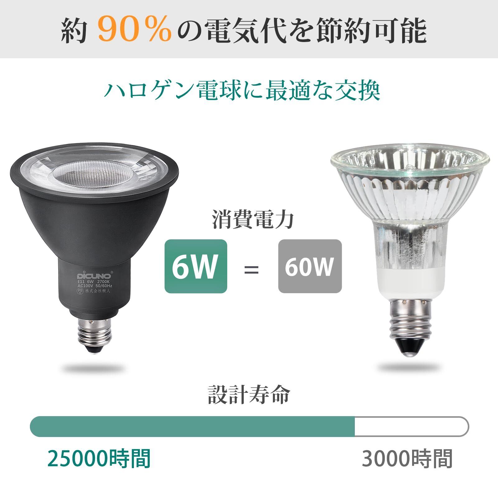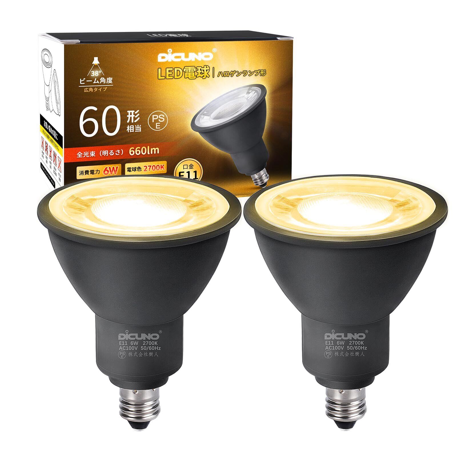 DiCUNO E11口金 LED電球 スポットライト 電球色 6W 60W形相当 2700K 660lm LEDスポットライト 密閉器具対応 広角タイプ AC100V 非調光 PSE認証済み 2個入 ブラック