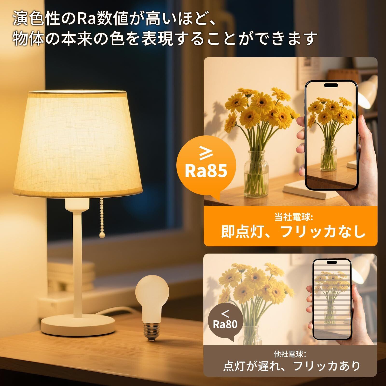 ◎眩しさを防ぐ·高演色性:LED電球は高品質のすりガラスで作られ、透光性が高く、光が均一で柔らかく、明るく、眩しさを防止しています。長時間使用しても、目が疲れません。演色指数(CRI)≥85の高演色性は、物体本来の色を自然に再現することができる。LED電球は小型で軽量、取り付けが簡単で、スイッチを入れた瞬間に点灯する。ダウンライト、ウォールランプ、シーリング、玄関灯、ブラケット、卓上ランプなどの照明器具に簡単に使用できます。