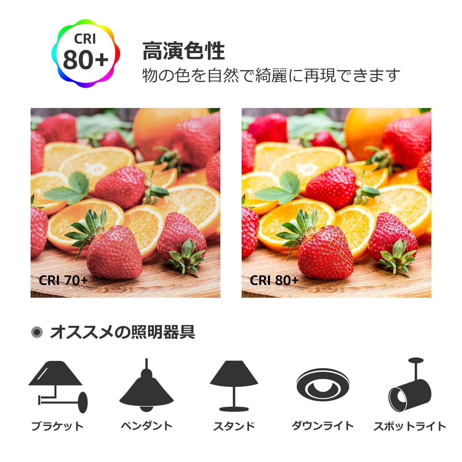 【広配光タイプ・高演色性】心が落ち着いた電球色で、照射角度は230°に達し、広範囲を明るく照らしてくれます。また、放熱性に優れ、密閉形器具にも利用可能で、ダウンライト、ウォールランプ、ペンダント、シーリング、シャンデリア、スタンド、ブラケットなど幅広く使用できます。更に、安全安心な照明環境を提供だけでなく、電球の演色性もRa80を超え、色彩を鮮明に表現し、美しい空間を演出します。トイレ、浴室、キッチンなど切れたら困る場所に活用され、帰省する時、両親に喜ばれるギフトです