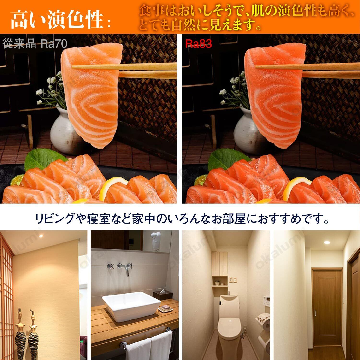 【仕様】本体重量:35g、定格消費電力:4.2W、色温度:2700K(電球色相当)、全光束:450lm、平均演色評価数 : Ra83、ビーム角:200度(広配光タイプ)。