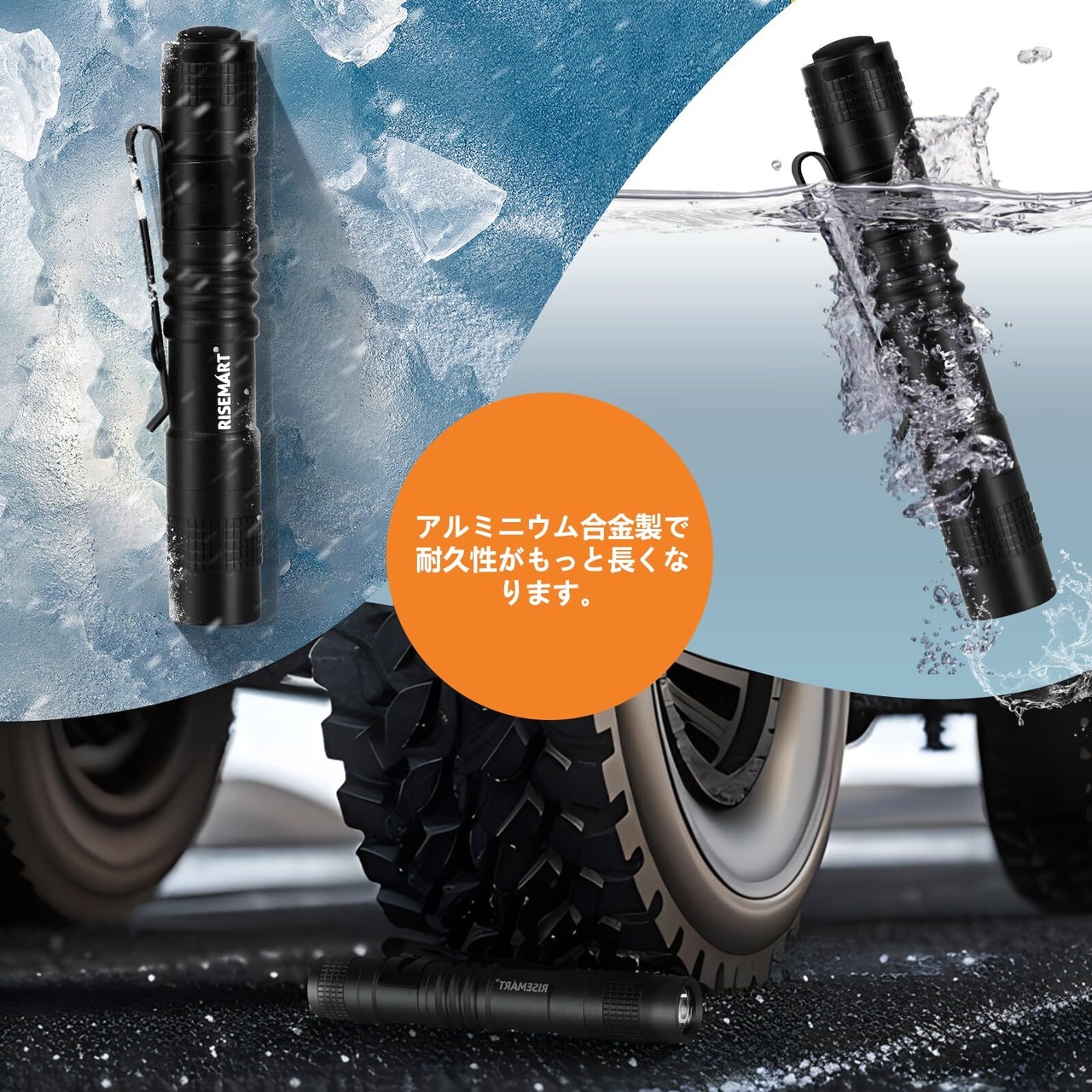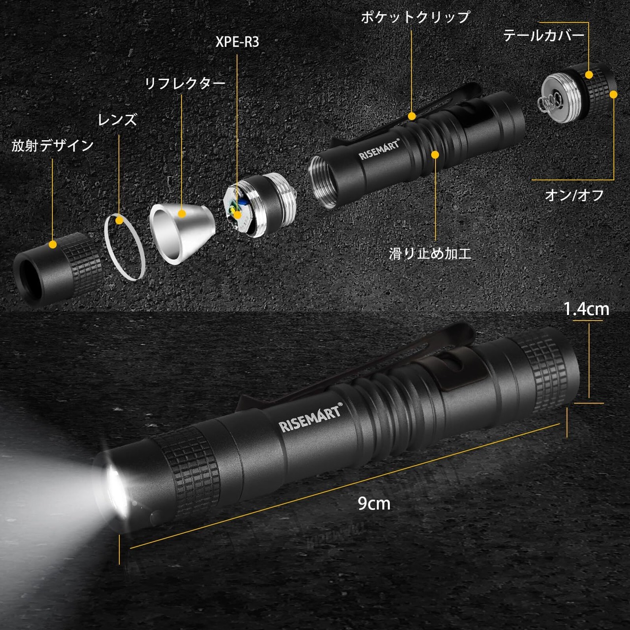 RISEMART LED 懐中電灯 小型 ペンライト 高輝度 120ルーメン アルミ合金製 防水 ミニライト クリップ付き 高耐久 作業 防災 単四電池対応(充電池対応不可)