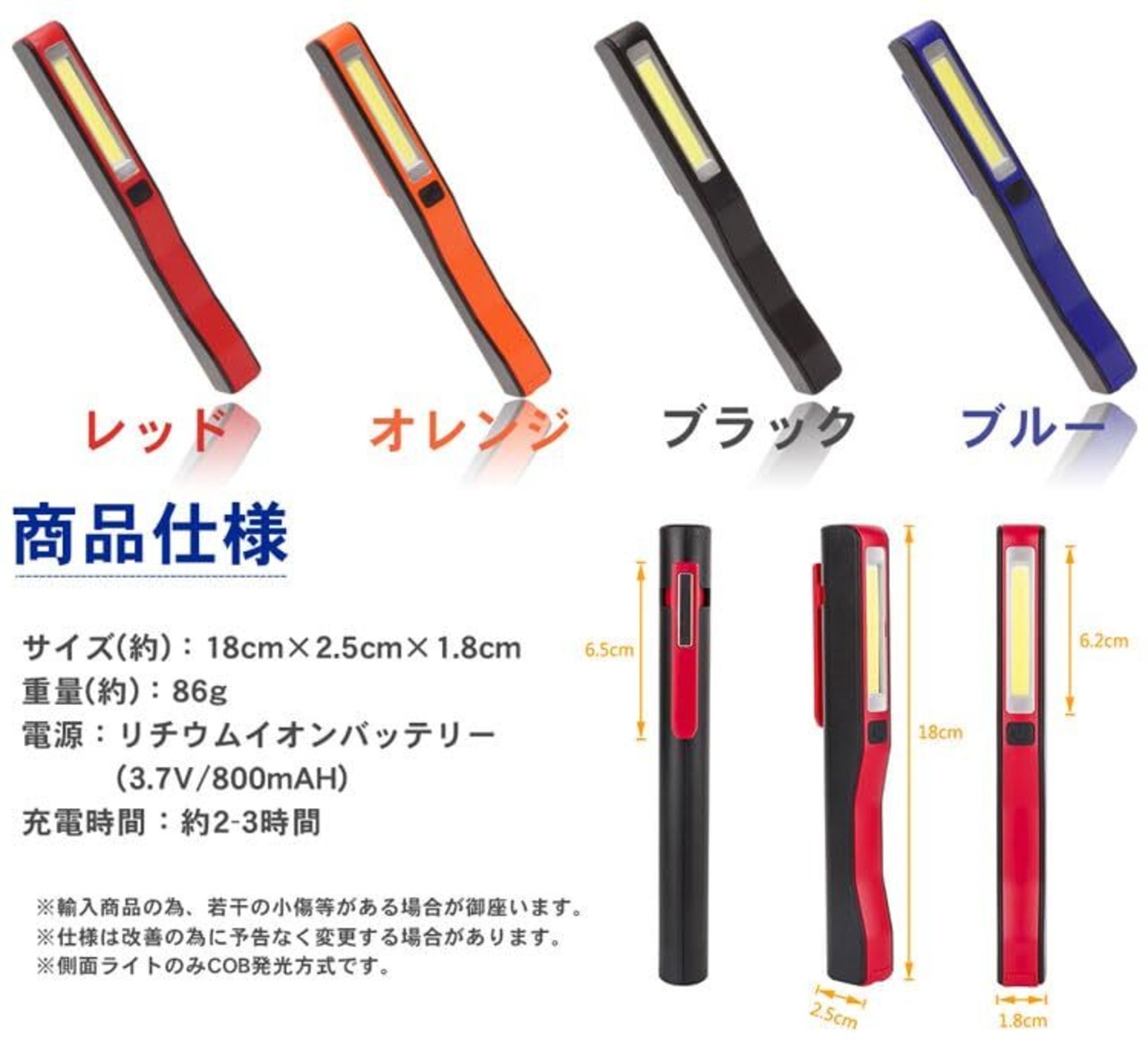 【2WAY】充電式 COB ワークライト 高輝度 強力 LED 懐中電灯 作業灯 切り替え クリップ マグネット付き スリム 携帯 コンパクト 車 整備 検査 (ブラック) PR-USB-COB-BK