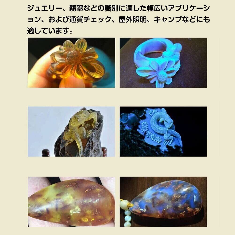 【商品仕様】目的: ジュエリー懐中電灯;光玉:光玉4個;光源:白色光(強光-弱光)、淡黄色(強光-弱光)、365紫光+395紫光;バッテリー: 充電式リチウム電池;容量: 3200MAH (付属);充電方法:USB充電;LED 寿命: 100000 時間。
