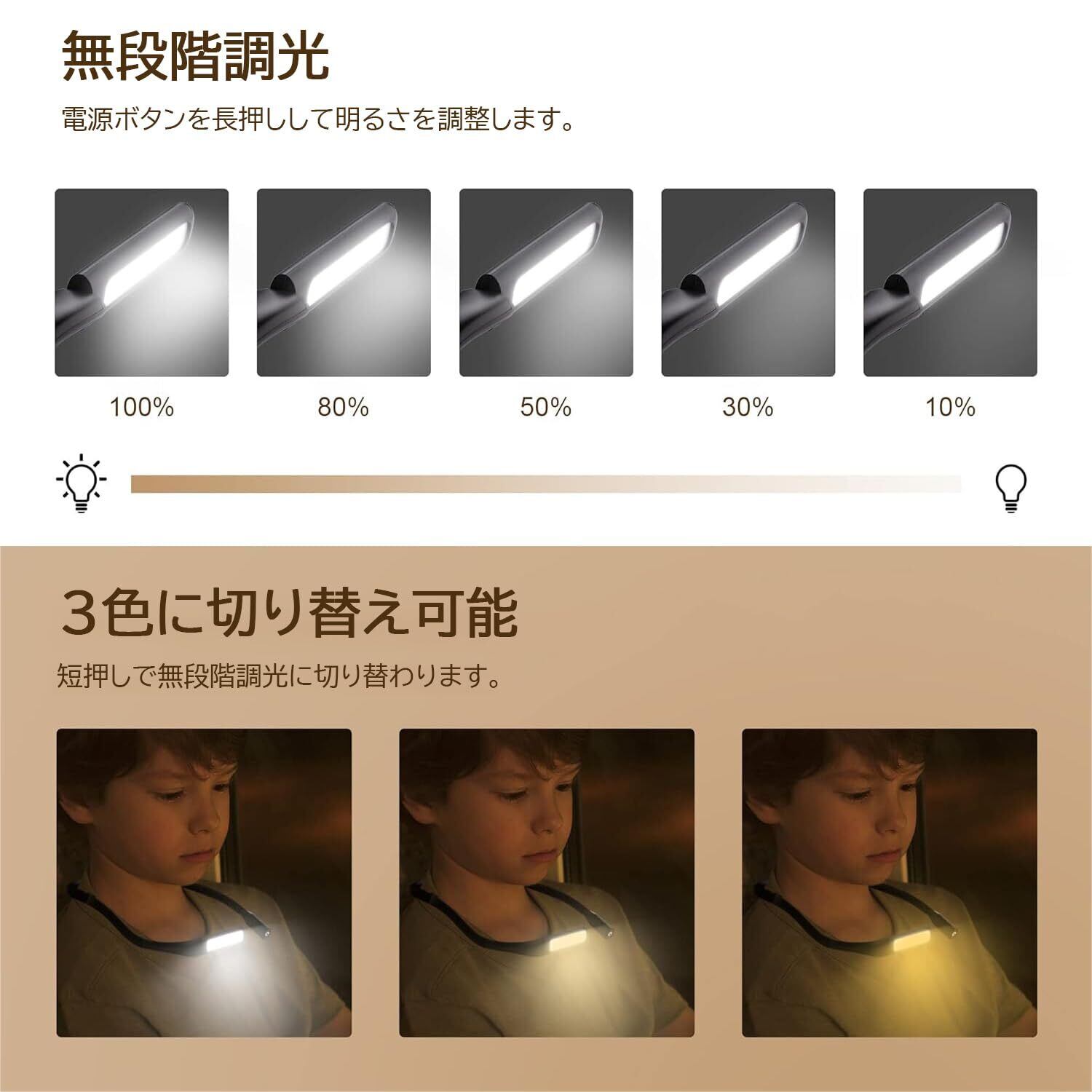 ネックライト 充電式 首掛けライト ブックライト LED 手振りセンサー 散歩ライト 釣りライト 読書ライト IPX4防水 3種色温度 無段階調光 Type-C充電式 360°角度調整 読書 釣り 散歩 停電時防災用