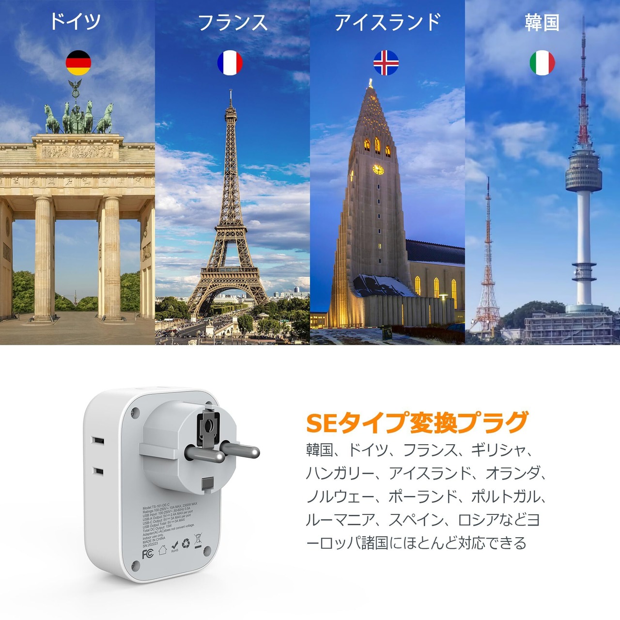 【目的地国の必要品】本体サイズは56×79×67mmで、コンパクトなので、海外旅行中も簡単に携帯できます。SEタイププラグは、韓国、ドイツ、フランス、ロシア、アイスランド、スペイン、ギリシャ、ノルウェーなどの国々へ旅行する際に役立ちます。