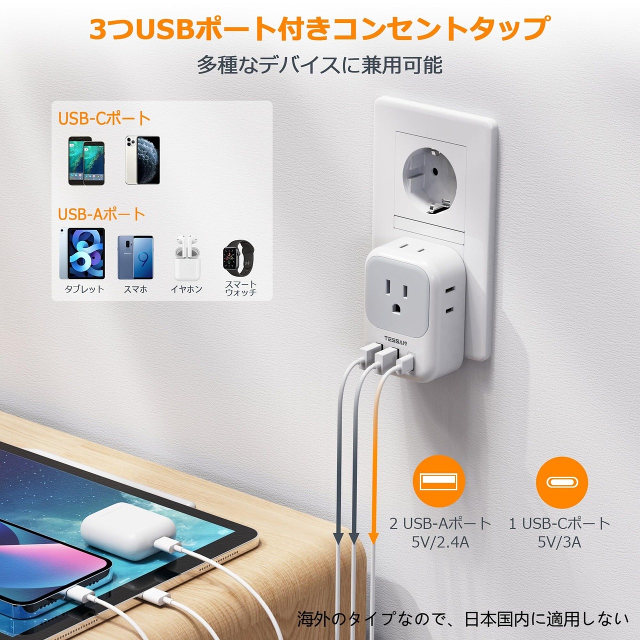 TESSAN 変換プラグ 韓国 SEタイプ コンセント変換器 4個AC差込口 1USB-Cポート 2USB-Aポート付き ドイツ、フランス、オランダ、ハンガリー、スペインヨーロッパなどの国に対応