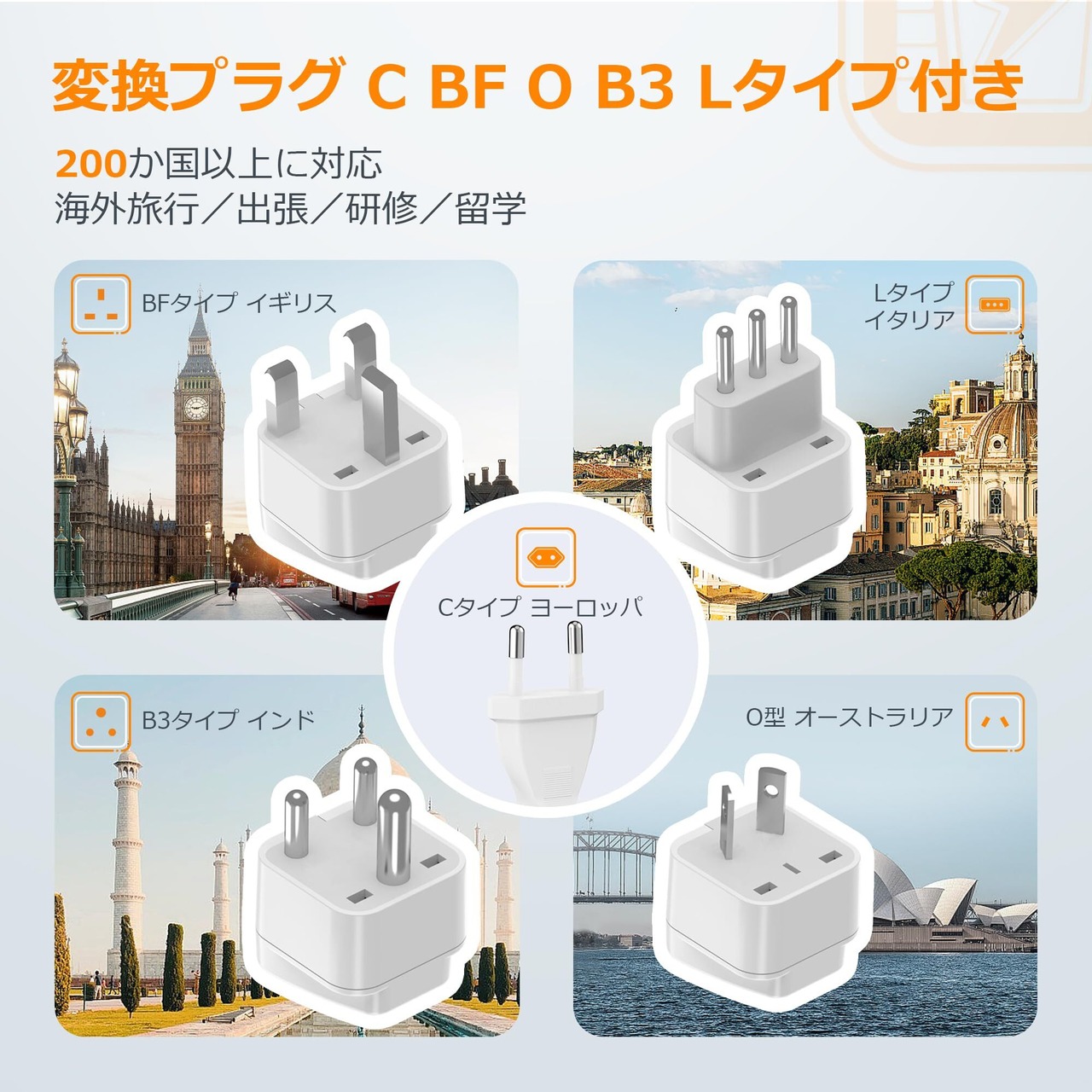 【変圧器 海外旅行用】110v 220v 変圧器はcタイププラグ付き延長コート1本とBF・O・B3・Lタイプ変換プラグを備えています。韓国(一部)、イギリス、ヨーロッパ、イタリア、オーストラリア、フランス、ドイツ、スペイン、インド、クウェート、中国、香港、ポルトガル、ドバイ、イギリス、フィジー、アイルランド、アルゼンチン、ロシアなど、世界200カ以上の国・地域へ修学旅行に大活躍します。