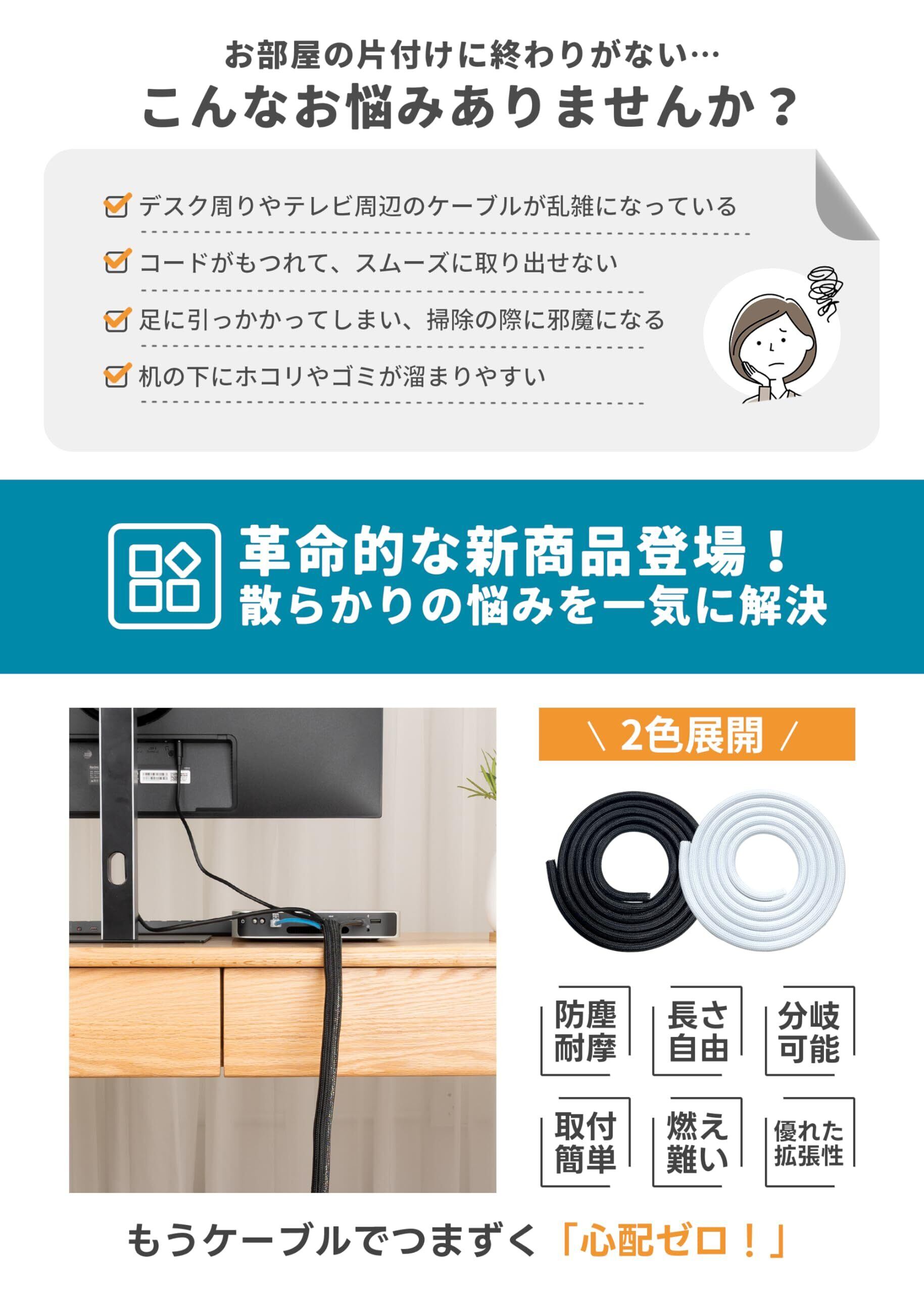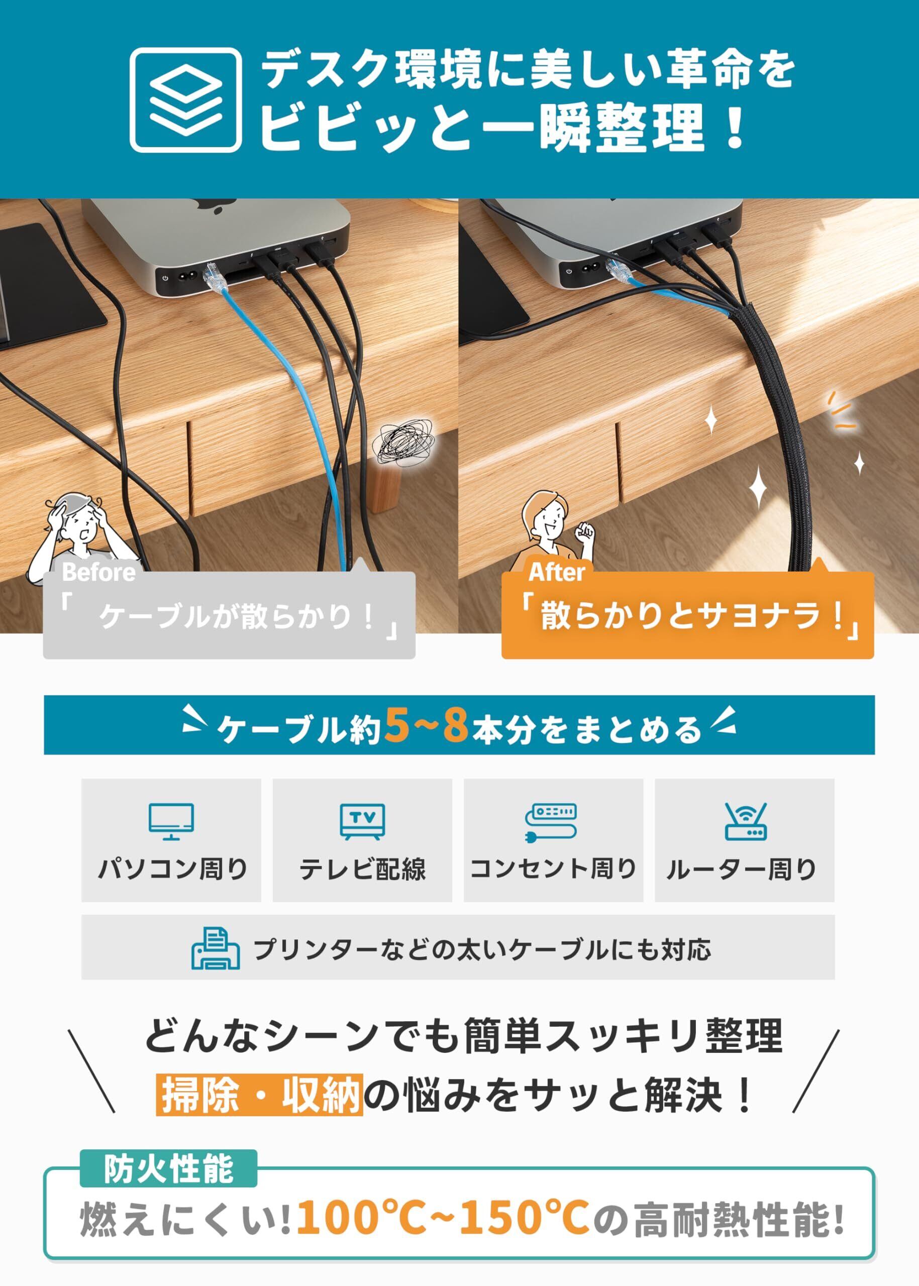 【耐久と防火両立・安全をしっかり守る】このケーブルスリーブは優れた耐久性を誇り、日常的な摩擦や摩耗にもしっかり対応します。また、家庭にペットがいる方にも適用的で、ペットの噛み癖からケーブルを守ることができます。さらに、UL94-V1規格に準拠した防火性能を備えており、万が一のケーブル内部の発火や外部からの高温灼熱に対しても、確実に火の手を防ぎます。この強力な防火性能により、家庭やオフィスでの使用にも安全性をします。安心してお使いいただける製品です
