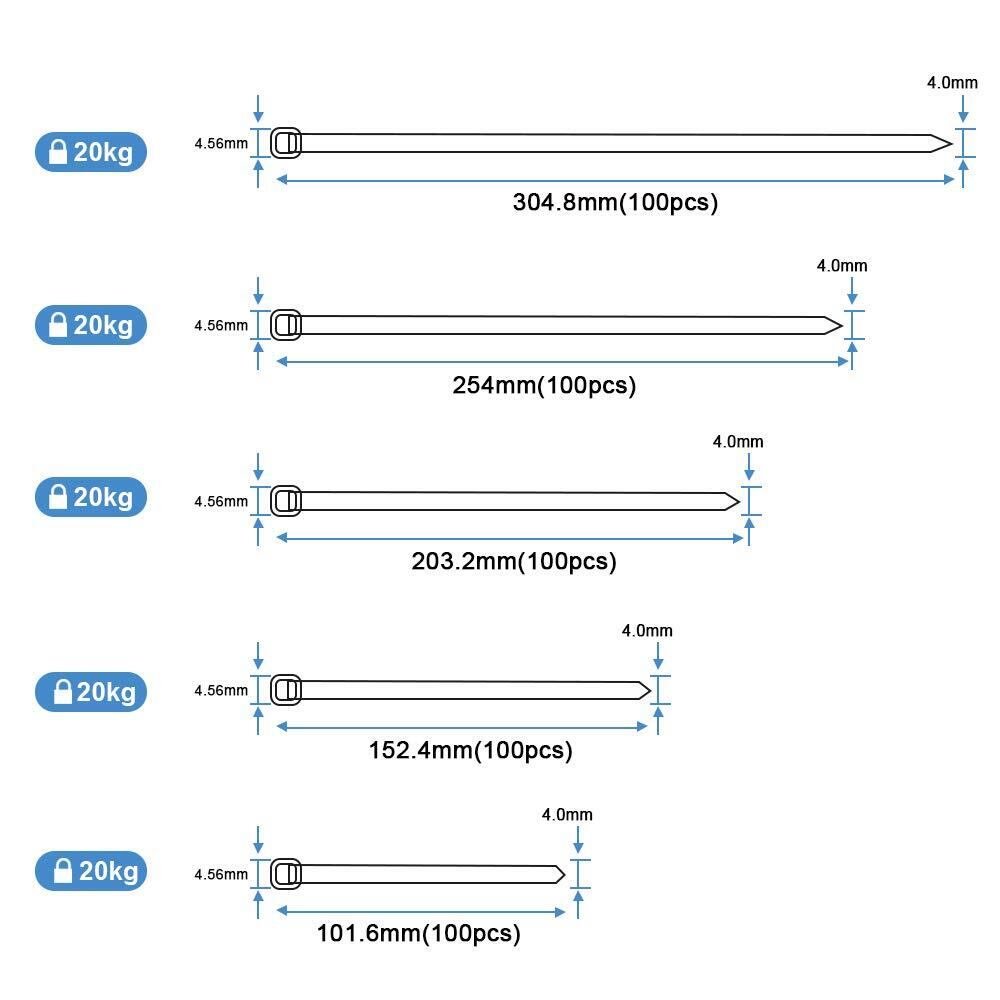 【丈夫で丈夫】・幅と厚みで強度が決まります。当社のケーブルタイ幅の範囲:4mm。長さの範囲:100-300mm、広く使用されている、引張強度:20kg,はあなたの最も困難なタスクを処理できます。