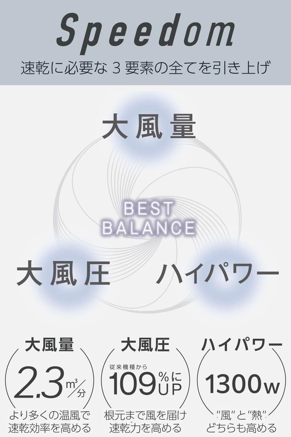 1大風量 2.3m3/分※3 大風圧 従来機種から109%にUP※43ハイパワー1300W 大風量でも温かい風で快適ドライ