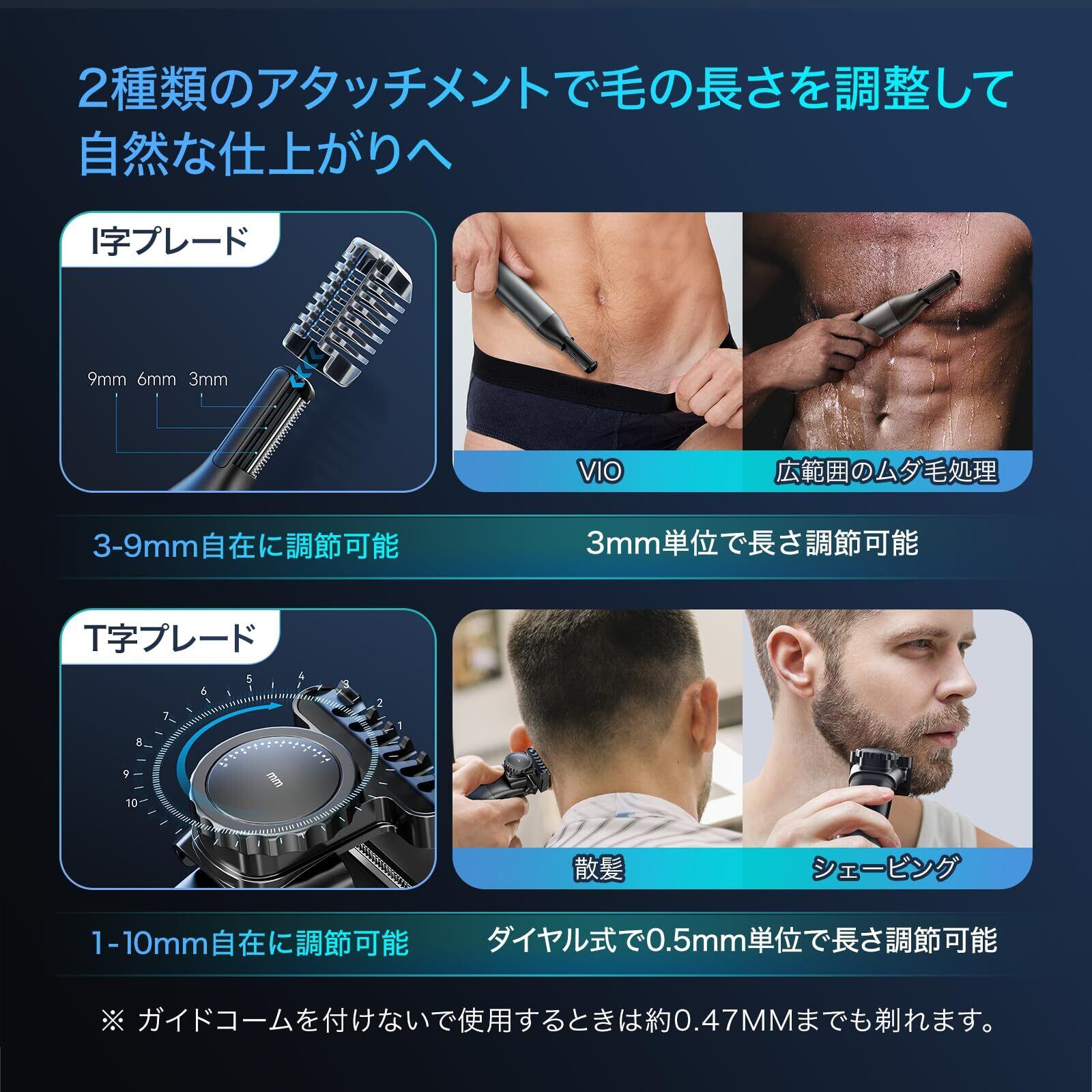 ▶2種類プレード&2種類コーム◀刃が横についているI字プレードは持ち方を選ばず、全身剃りやすい形状です。キャンプ式コーム装着で3mm/6mm/9mmからカスタマイズできます。小回りが利くT字プレードではバリカンのような形状をしており、長さを整えることができます。ダイヤル式コーム装着で0.5mm単位で1mm~10mmを20段階で調節できます。コームを装着せずに使用するときは約0.47mmの長さまで剃れます。カットする毛の長さを調節でき、ほどよく毛を残すことも可能です。デリケートゾーンにも使える肌保護用コームですので、コームでしっかりと毛を起こすと剃りやすいです。使用する場所に合わせて自分好みに細かくカスタマイズできます。
