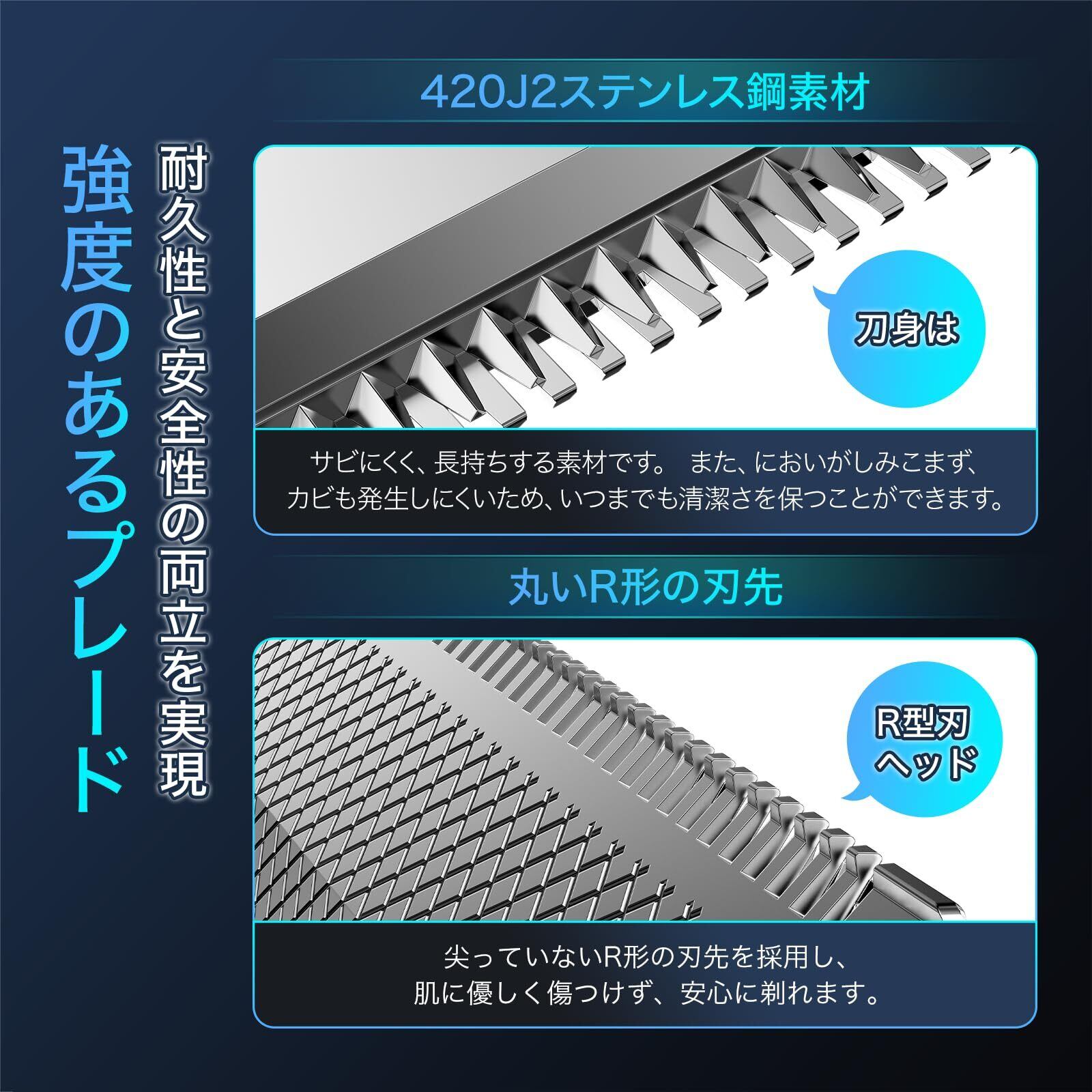 ▶丸みのある両面R形刃先で優しい剃り心地◀超高速モーターが搭載されているので、毛が引っ掛かったりすることがなくスムーズに剃れます。この電動メンズ体毛シェーバーは刃の先端が尖っていないR形刃を採用。肌に直接刃が触れない構造になっているため、刃が肌に食い込まず、肌への負担が少なくなめらかに毛を整えることができます。安心・安全なムダ毛処理できます。各部位にあわせて持ち方を変えられる両面デザインを採用。VIOゾーン、丸みや凹凸のある部分も、やさしくタッチし、なでるように剃ることが可能です。カミソリ負けしやすいという方にも使いやすいです。